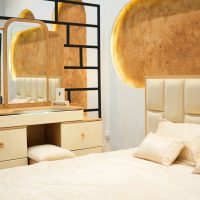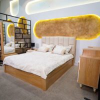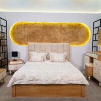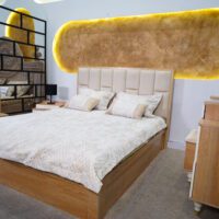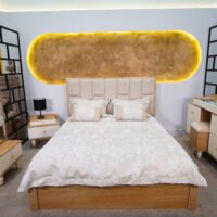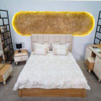 بدون شک یکی از نقاط قوت این محصول، پسزمینهی خاص پشت تخت است. دیوار بیضیشکل بافتدار با رنگ طلایی گرم و نور مخفی از لبهها، حس گالریمانند و بسیار خاصی به فضا میدهد. این نوع نورپردازی نهتنها جلوهای لاکچری ایجاد میکند، بلکه آرامشبخش نیز هست.