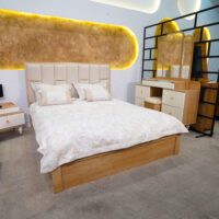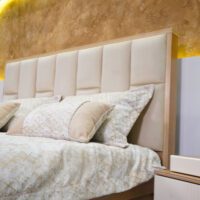 تشک، روتختی و بالشها با پارچهای بافتدار و لطیف در رنگی کرم و طلایی ملایم طراحی شدهاند. این انتخاب هوشمندانهی رنگ و بافت، به فضا حس لوکس و در عین حال صمیمانه میدهد. در عین حال، فرم کلی تخت خواب بهگونهای طراحی شده که سطح تماس نرم و راحتی برای خواب فراهم میکند و حس تعلیق از زمین باعث میشود فضا بازتر و سبکتر به نظر برسد.