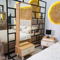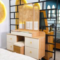 میز آرایش سهبخشی این سرویس، نقطهی عطفی در طراحی کلی آن بهحساب میآید. طراحی آینههای منحنی با فرم ایستاده، حس نرمی و ظرافت را با سبک مدرن ترکیب کرده. این میز شامل چهار کشوی بزرگ و یک قسمت مرکزی با آینه، بههمراه صندلی پاف چوبیست که هماهنگی کامل با تخت دارد.
