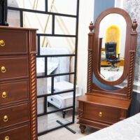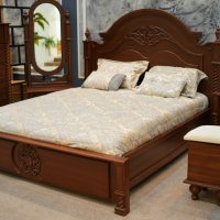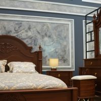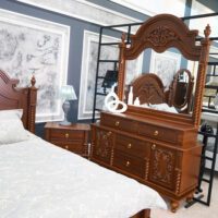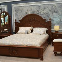 سرویس خواب یک و دو نفره کلاسیک فندقی شامل: تخت خواب، کف تخت فلزی با پایه های مقاوم، کنسول و آینه با صندلی و یک عدد پاتختی و یک فایل 5 کشو و یک آیینه قدی می باشد.