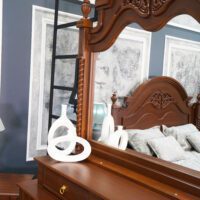 تاج بلند تخت با فرم منحنی و حجاری‌های دقیق، یادآور ستون‌ها و نقوش معماری کلاسیک یونان باستان است. نقش‌ونگار برجسته‌ی وسط تاج، نقطه‌ی تمرکز چشم است و هویتی مجلل به تخت می‌بخشد. استفاده از ستون‌های پیچ‌خورده در کناره‌ها نه‌تنها حس اقتدار بصری ایجاد می‌کند، بلکه باعث تعادل چشم‌نوازی در ساختار می‌شود.