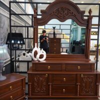 میز آرایش این سرویس، با فرم خمیده‌ی آینه‌ی اصلی و کنده‌کاری‌های کلاسیک، جلوه‌ای بی‌نظیر دارد. کشوهای متعدد، امکان نظم‌دهی دقیق به لوازم آرایش و زیورآلات را فراهم می‌آورد. نشیمن‌گاه پاف با پارچه‌ای لطیف و رنگ گرم، با راحتی کامل طراحی شده است.