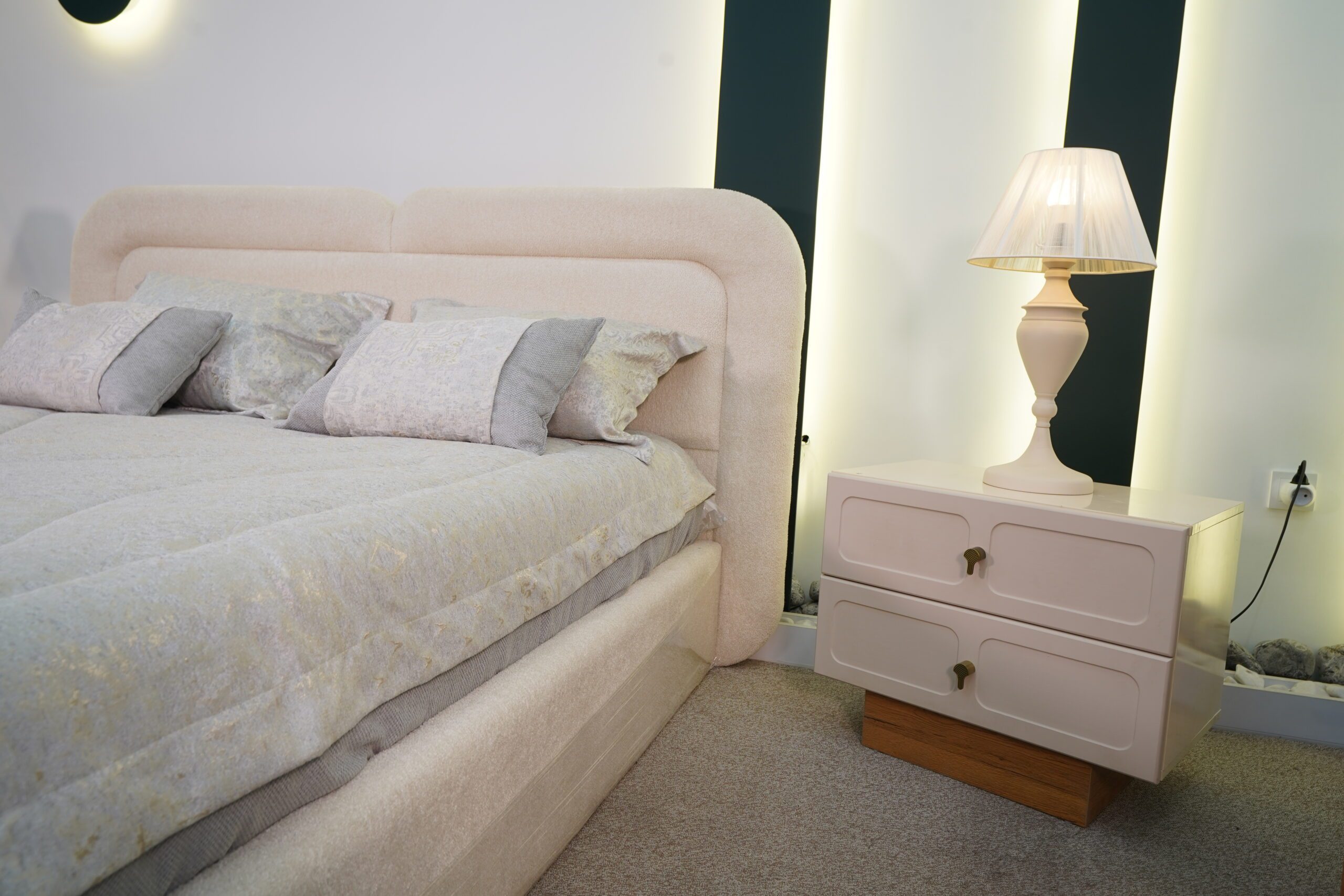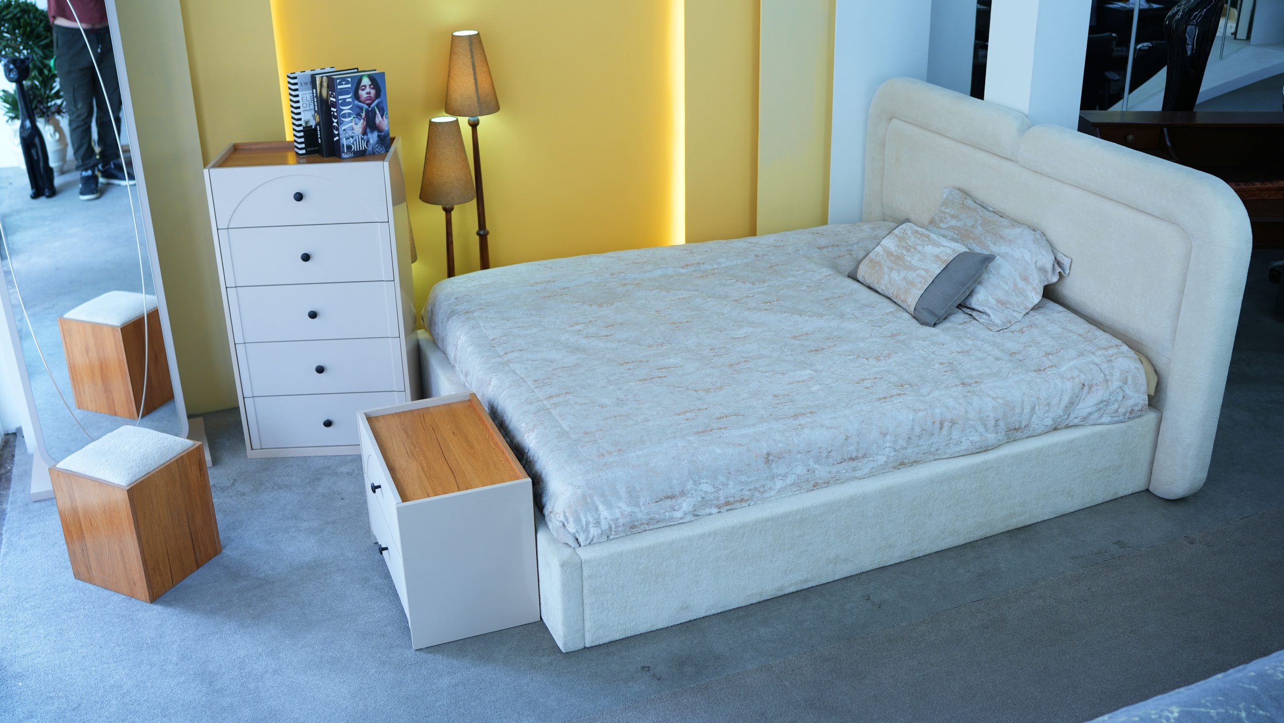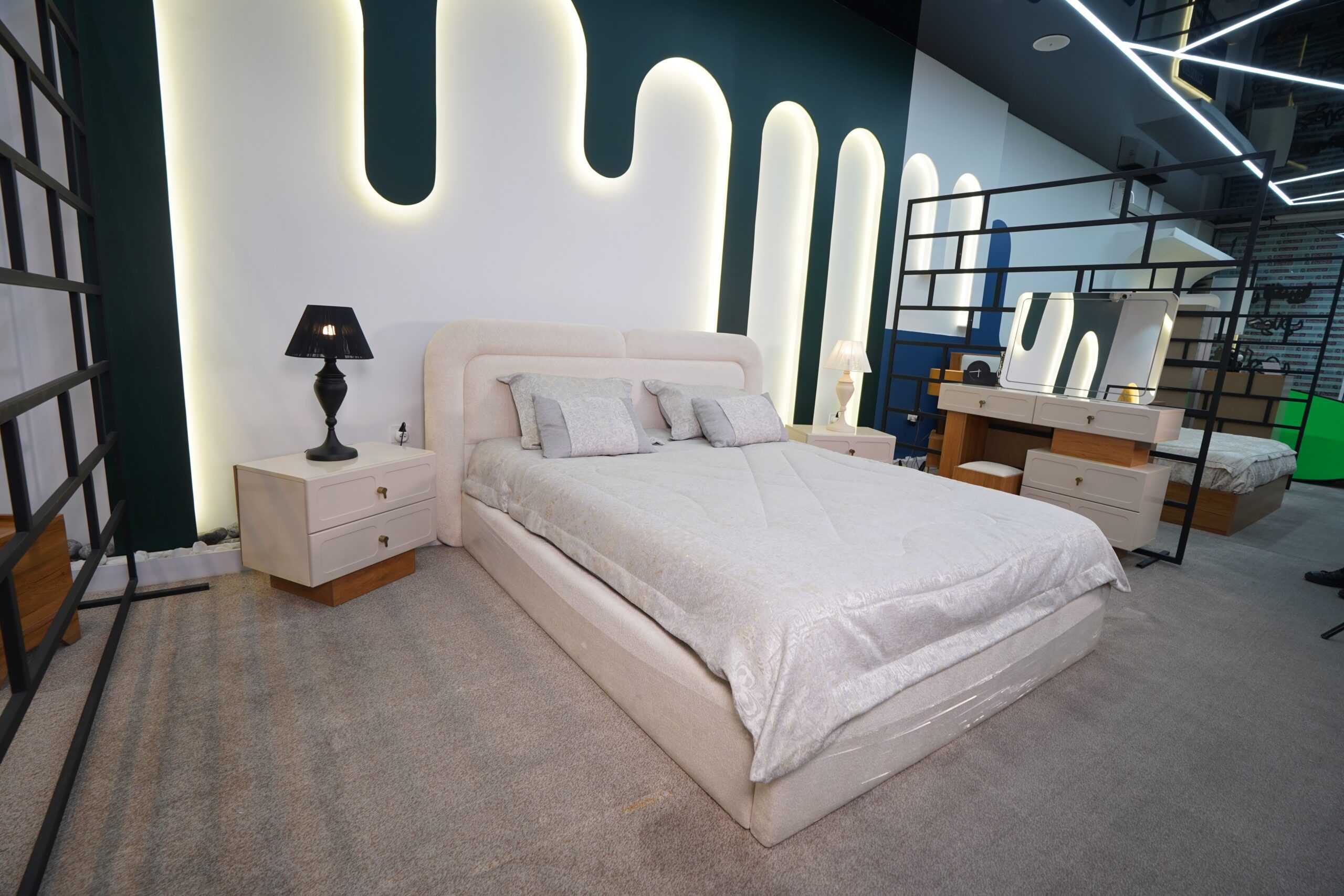تخت خواب مرکزی این سرویس با تاجی منحنی و خوشفرم، پوشیدهشده با پارچهای لطیف و مقاوم، نهتنها از لحاظ بصری دلنشین است، بلکه هنگام تکیه دادن حس نرمی و آرامش به شما میدهد. ساختار ساده اما دقیق آن باعث میشود فضا بزرگتر دیده شود و حس سبکی و سادگی بر اتاق غالب شود.