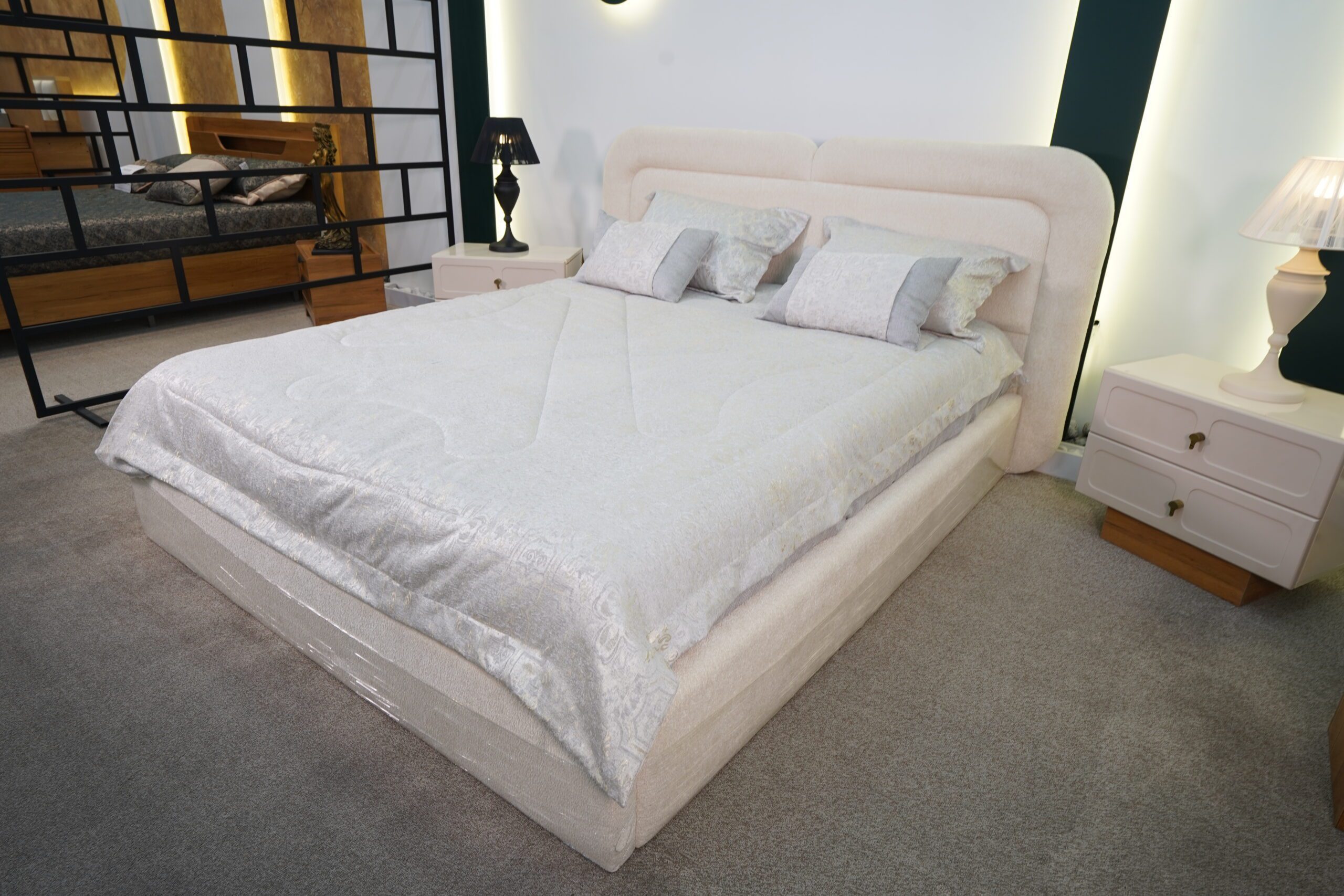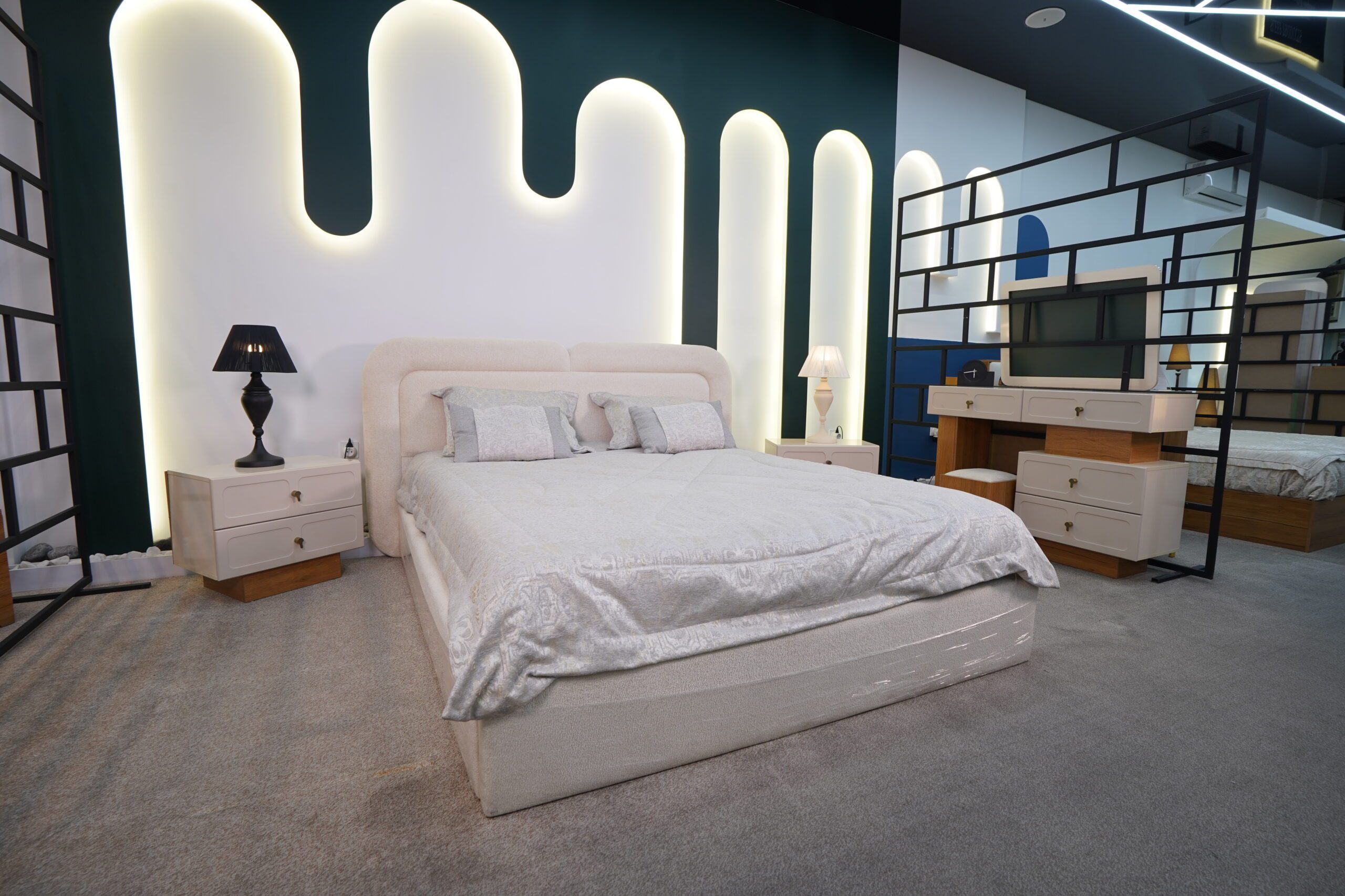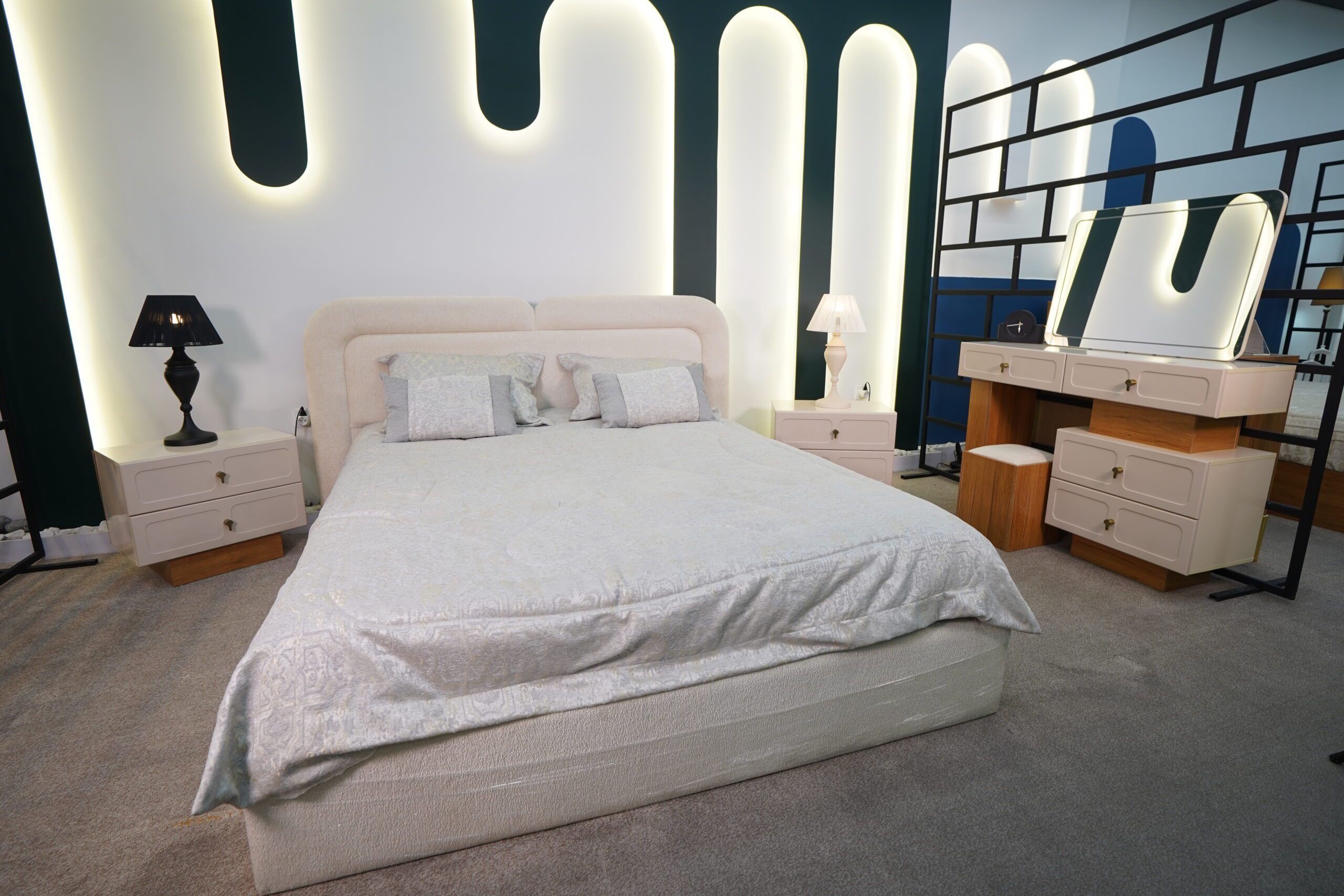 تخت خواب مرکزی این سرویس با تاجی منحنی و خوشفرم، پوشیدهشده با پارچهای لطیف و مقاوم، نهتنها از لحاظ بصری دلنشین است، بلکه هنگام تکیه دادن حس نرمی و آرامش به شما میدهد. ساختار ساده اما دقیق آن باعث میشود فضا بزرگتر دیده شود و حس سبکی و سادگی بر اتاق غالب شود.