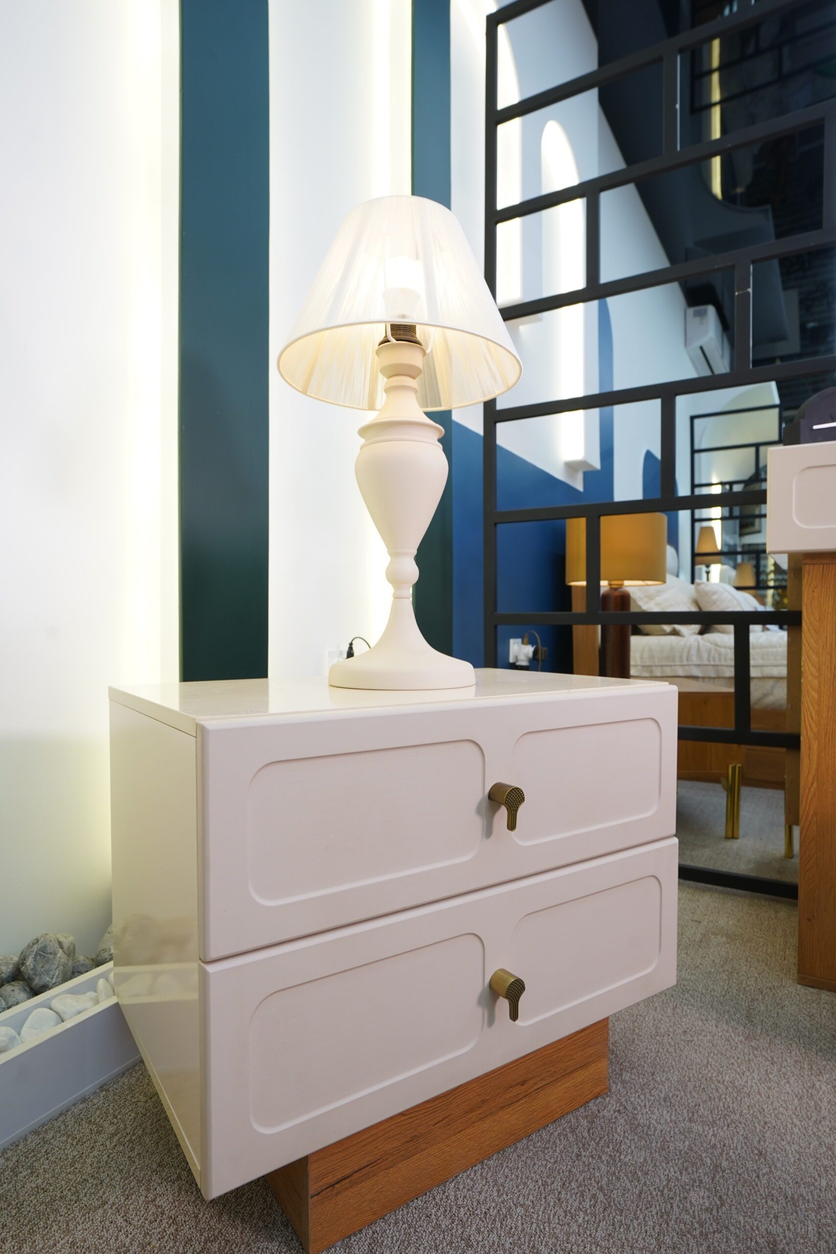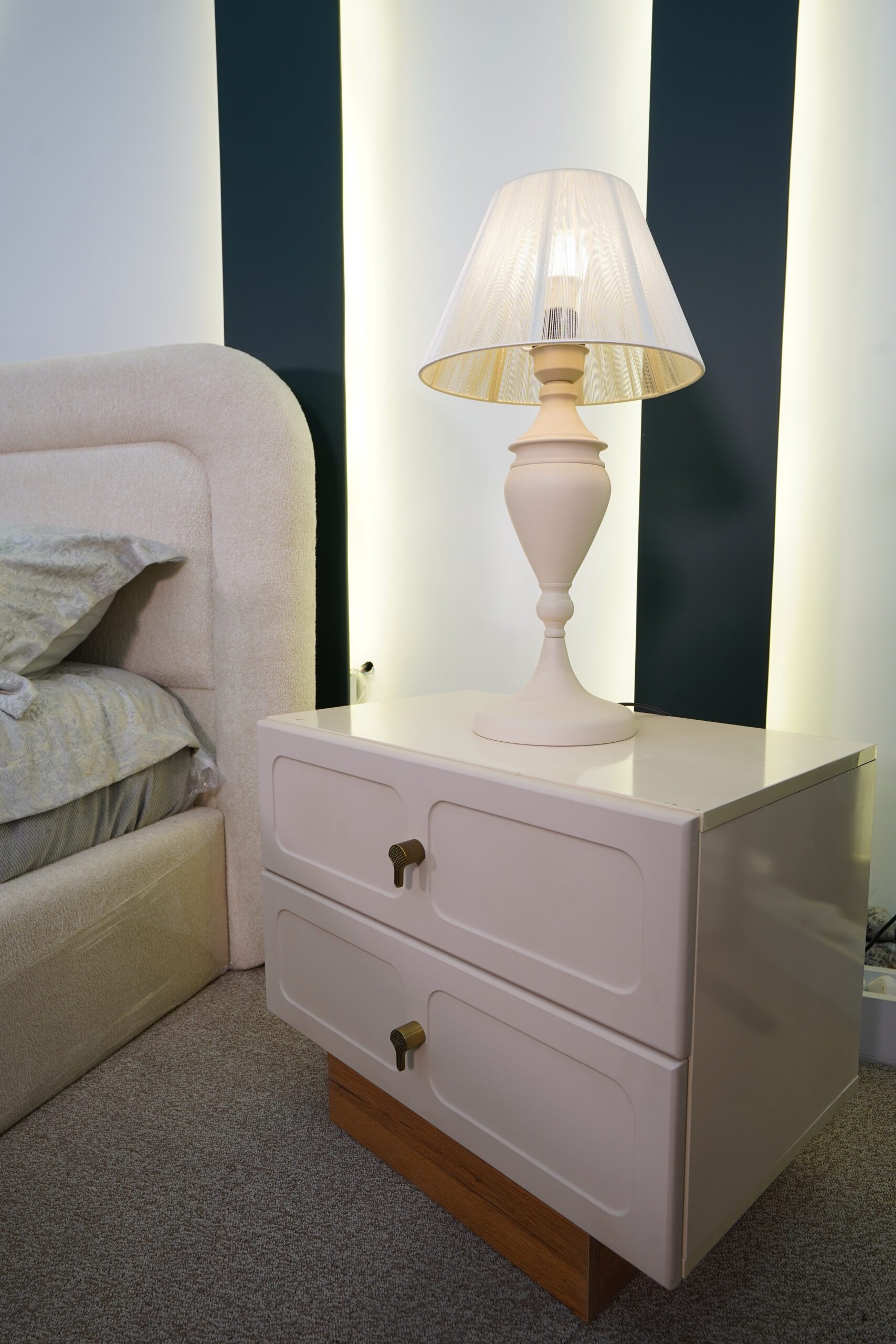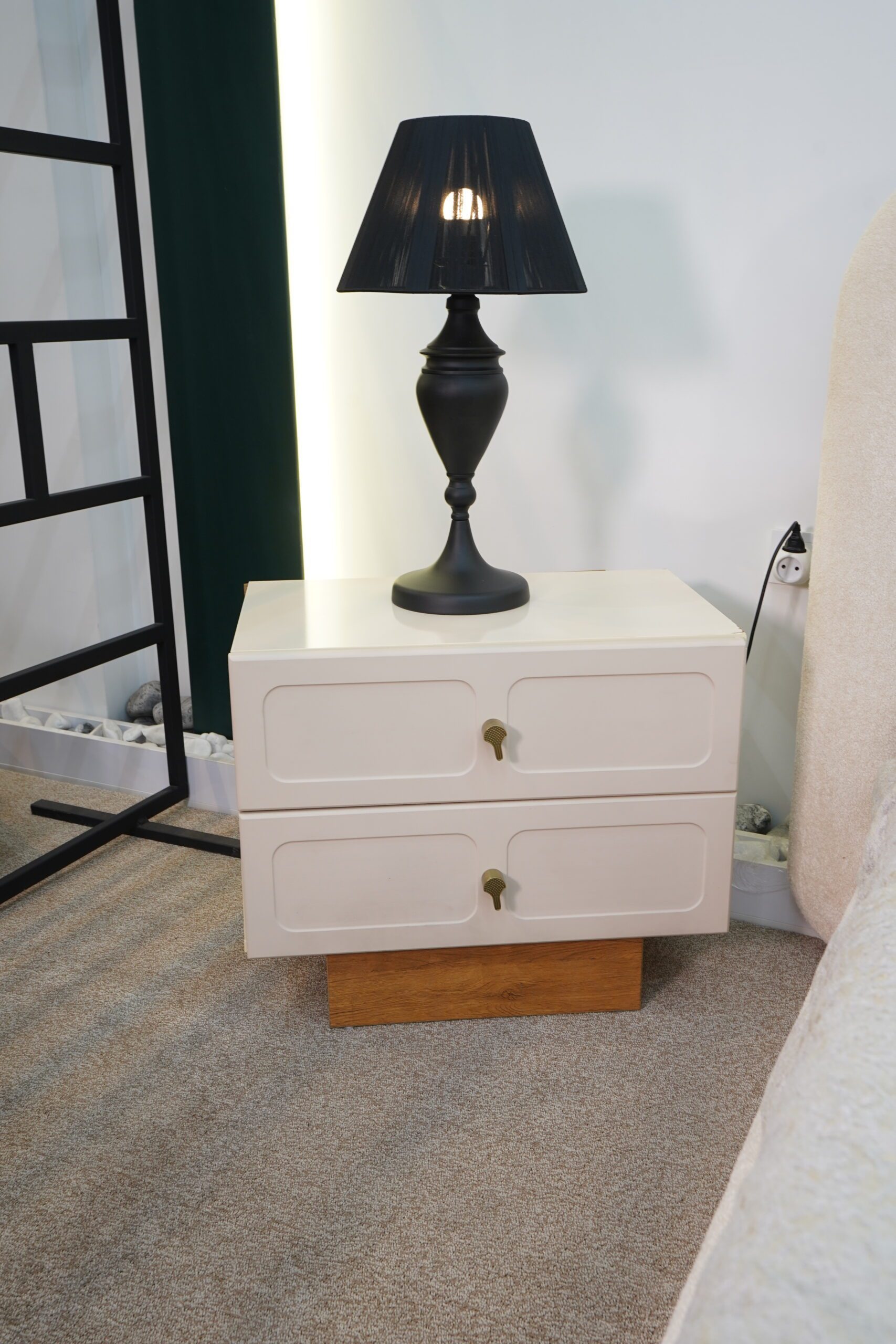 در دو طرف تخت، پاتختیهایی قرار دارند که ترکیب چوب طبیعی و بدنه کرمرنگ آنها بهزیبایی با طراحی تخت هماهنگ است. پایههای چوبی با رنگ روشن، دستگیرههای طلایی و سطح براق، این قطعات را به جزئی از دکور تبدیل کردهاند.