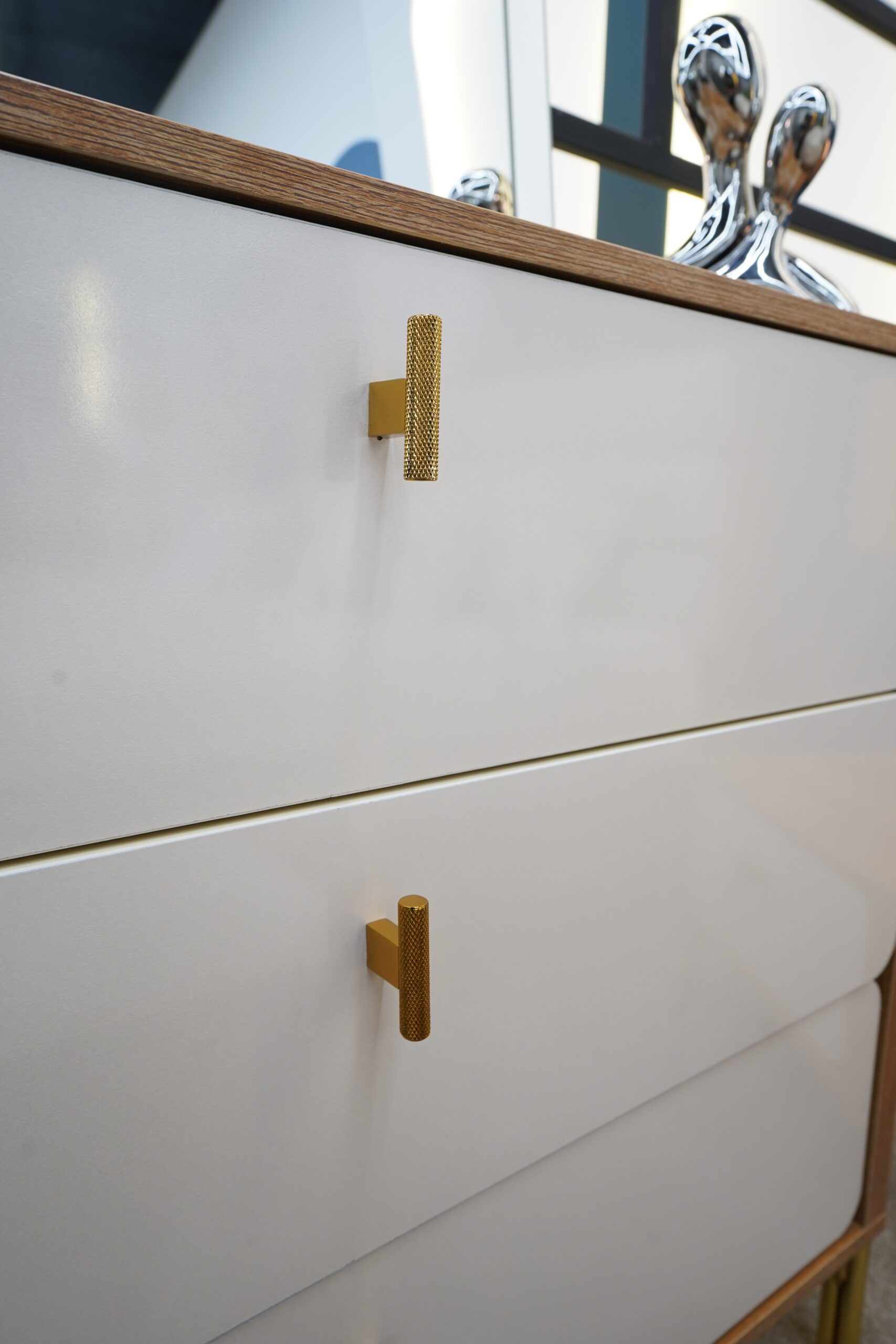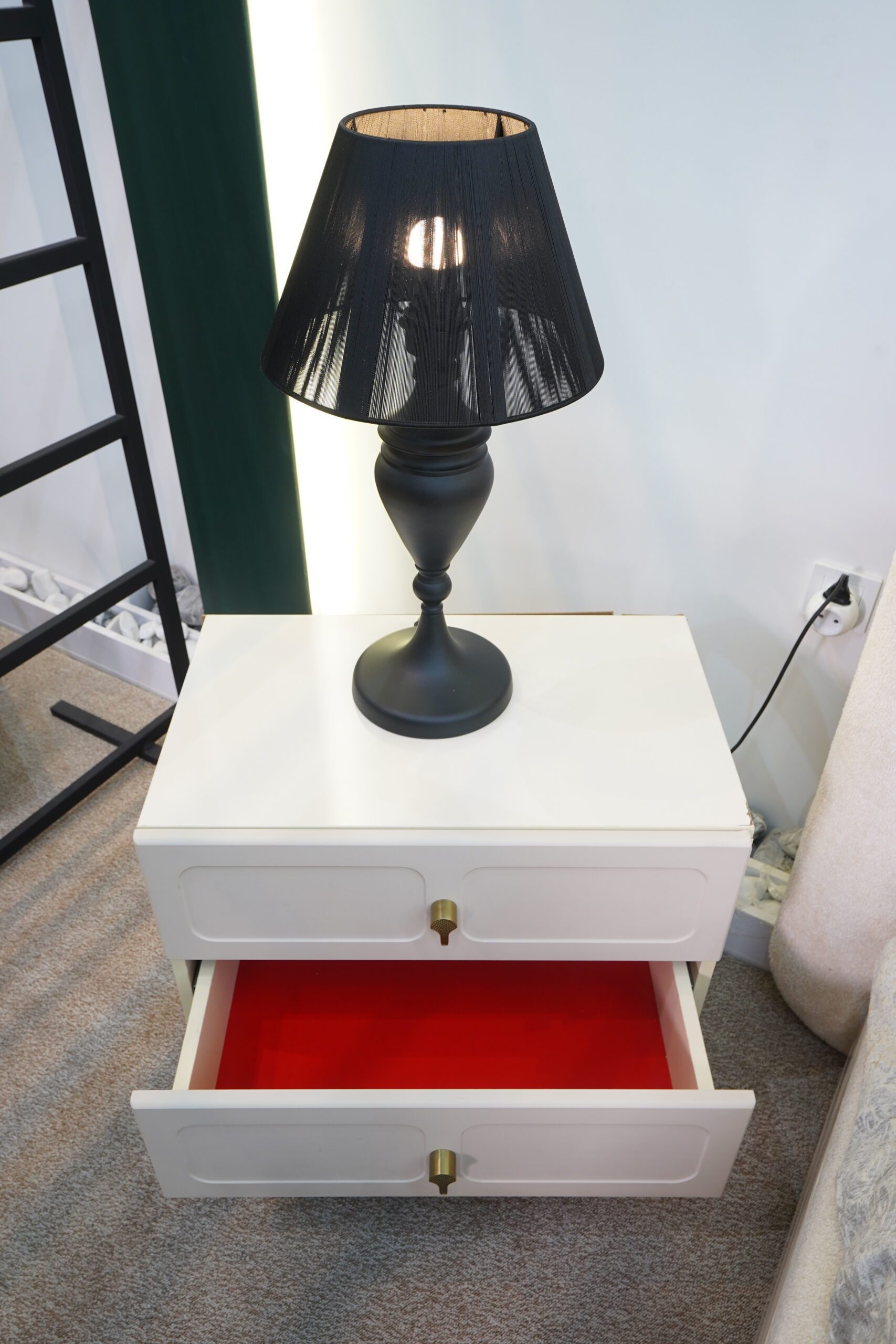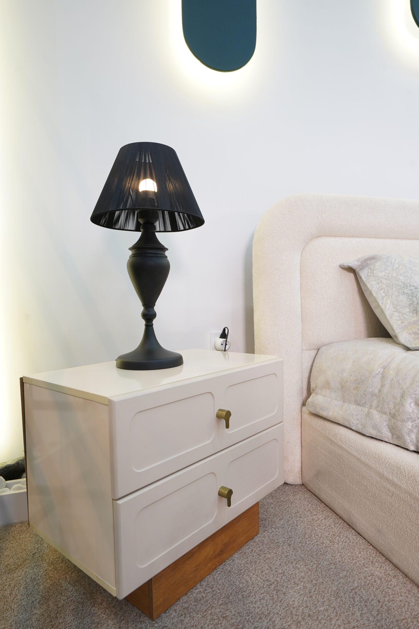 در دو طرف تخت، پاتختیهایی قرار دارند که ترکیب چوب طبیعی و بدنه کرمرنگ آنها بهزیبایی با طراحی تخت هماهنگ است. پایههای چوبی با رنگ روشن، دستگیرههای طلایی و سطح براق، این قطعات را به جزئی از دکور تبدیل کردهاند.