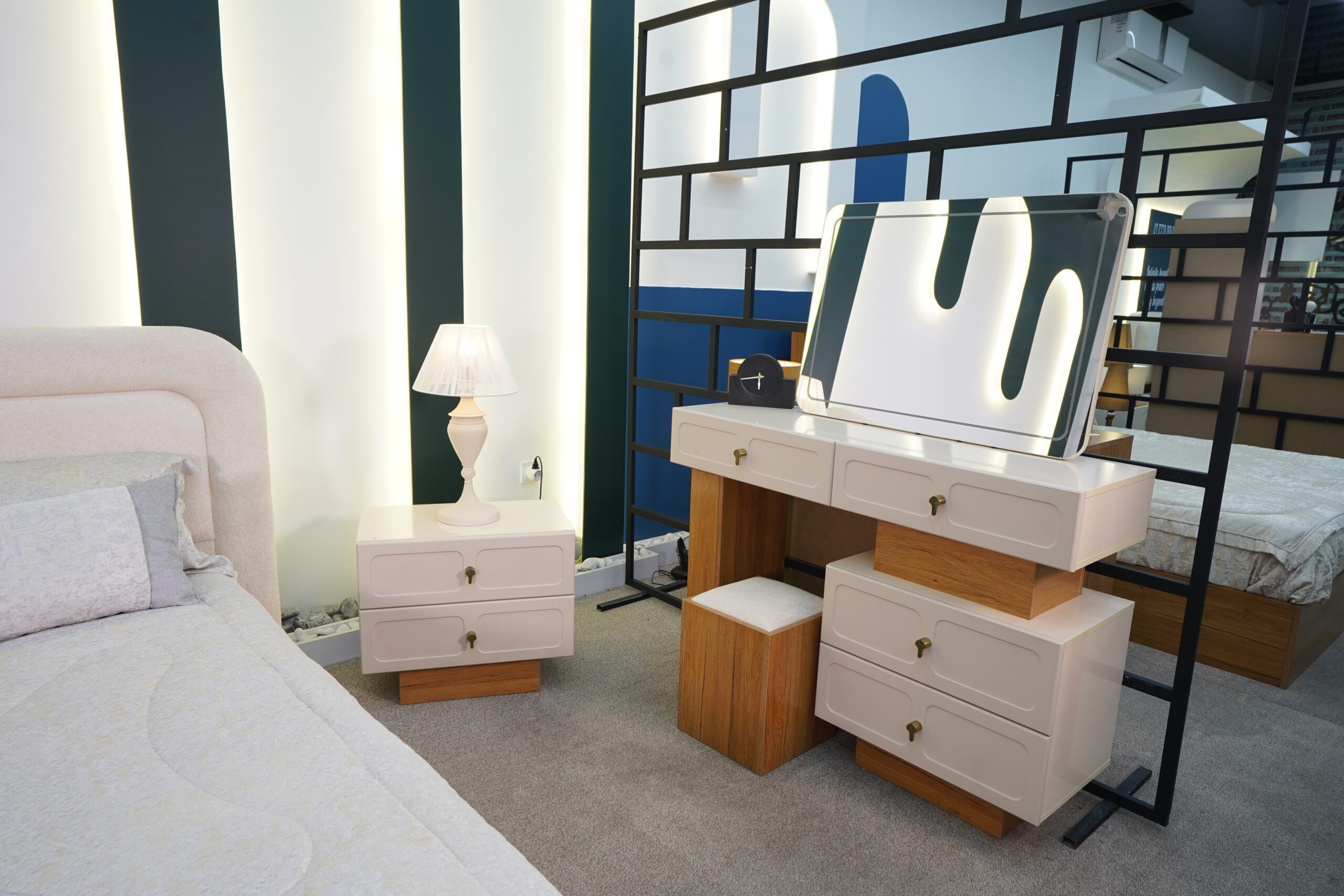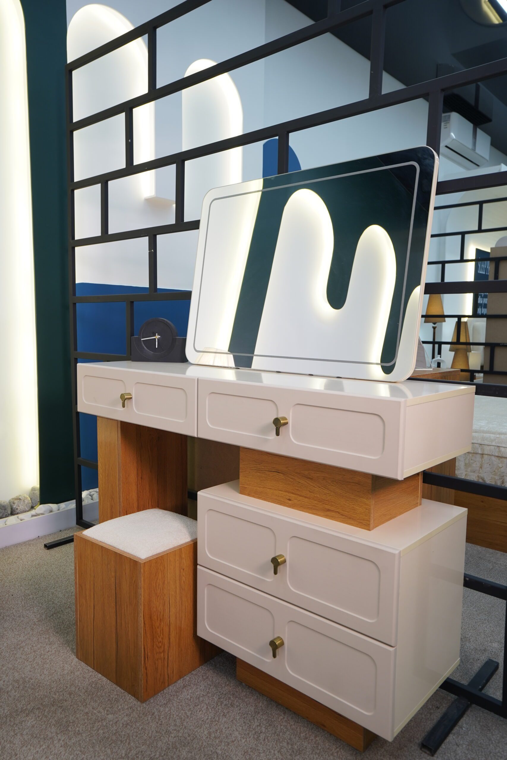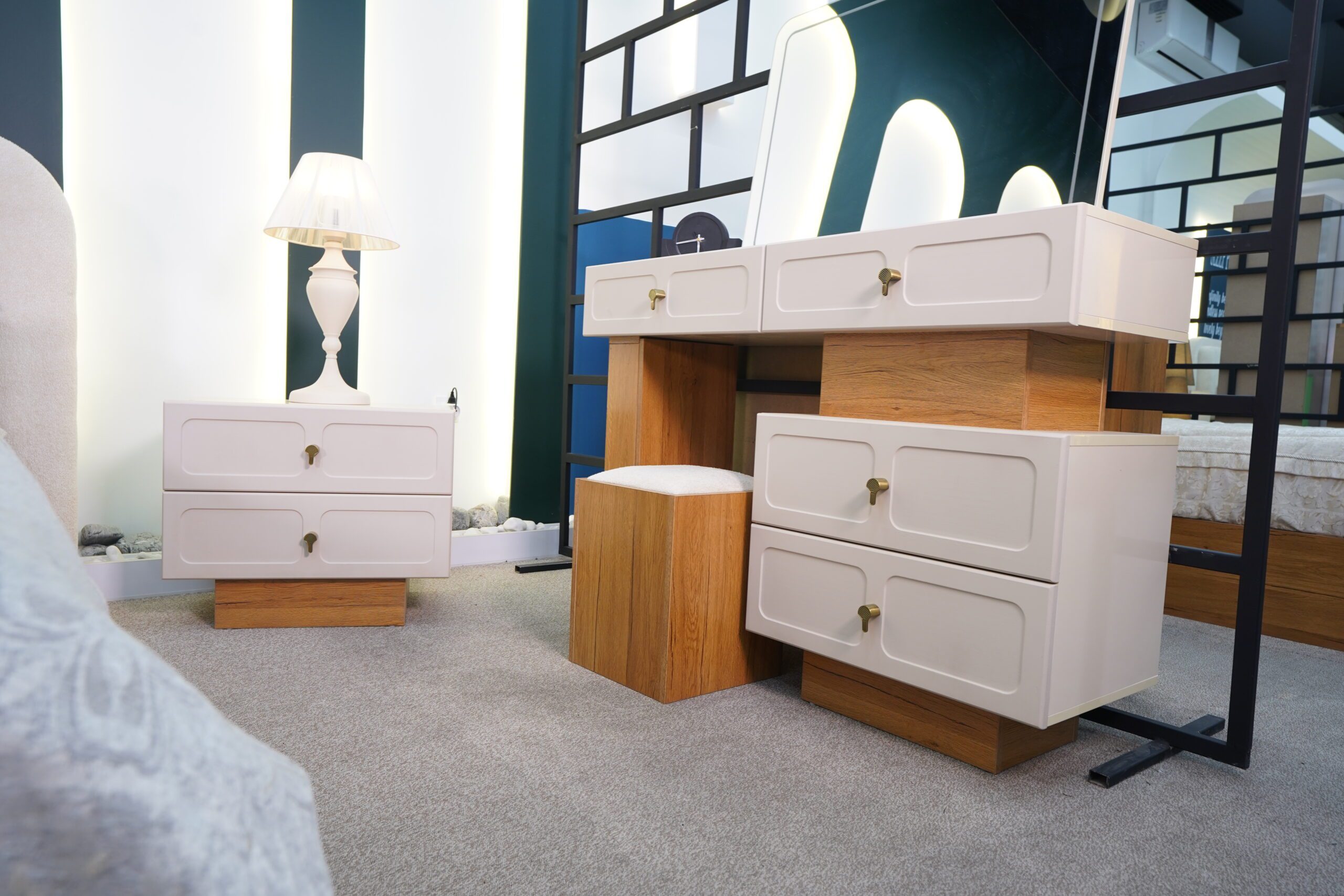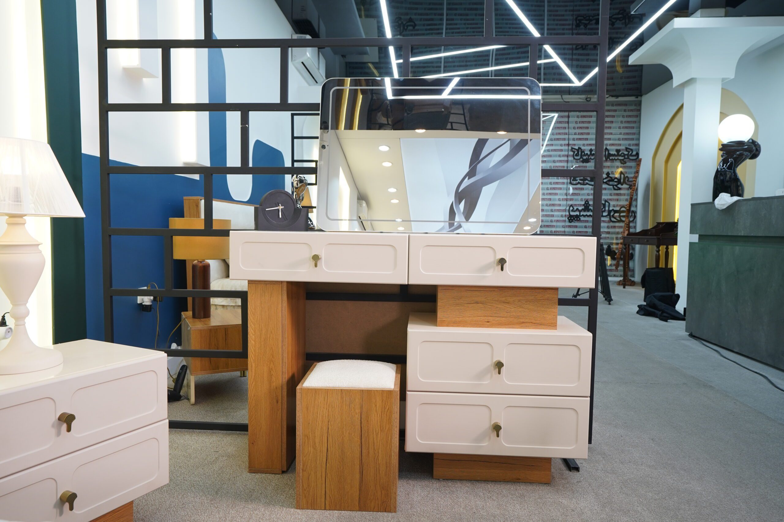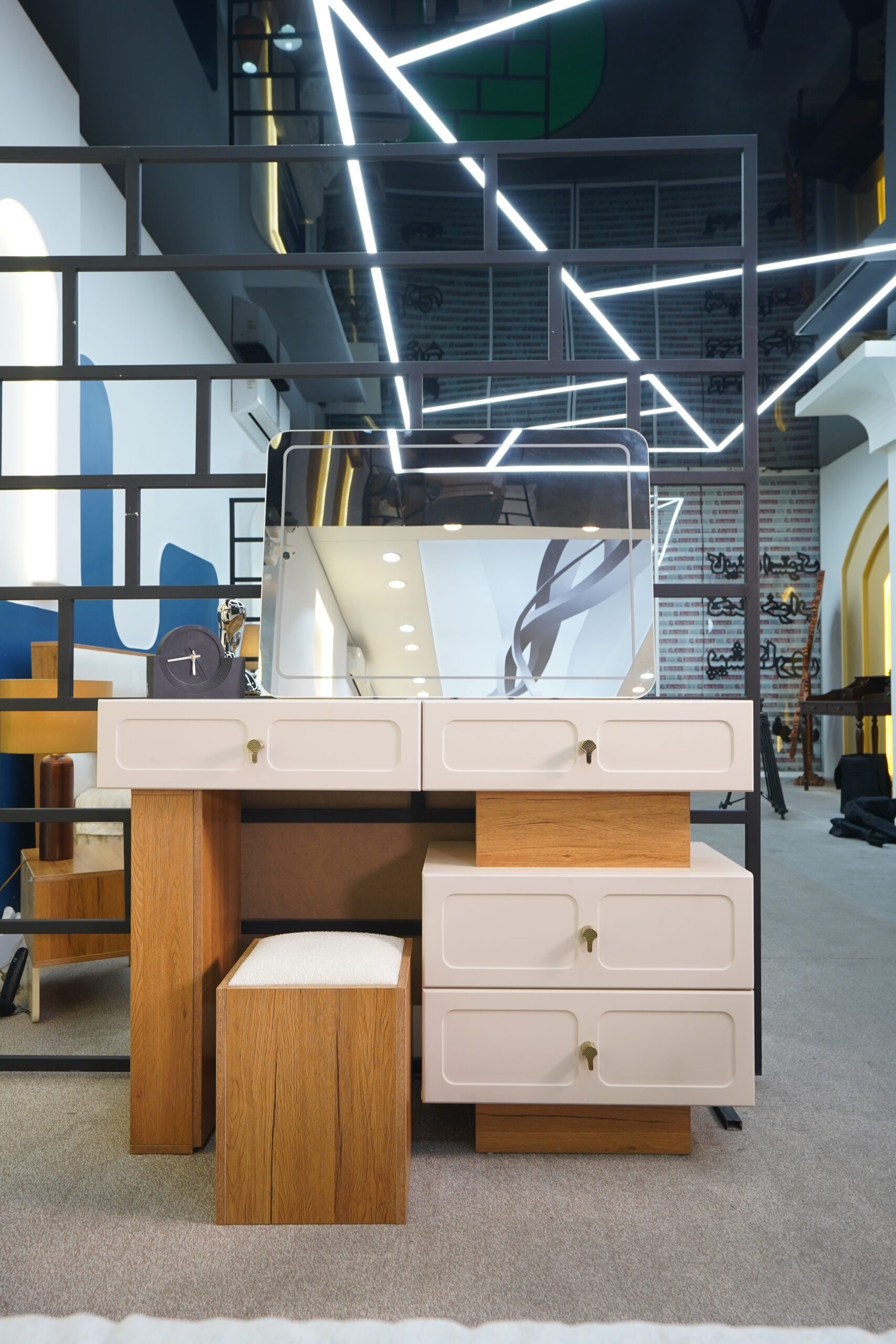 میز آرایش این ست، با فرم مکعبی و ترکیب رنگ کرم و چوب، نقطه تمرکز طراحی در فضاست. آینهی بزرگ و زاویهدار با بکگراند مشبک فلزی مشکی، ترکیب مدرن و خاصی را پدید آورده. صندلی مربعی با پایهی چوبی و نشیمن نرم، استفادهی روزانه از این میز را بسیار راحت میکند.