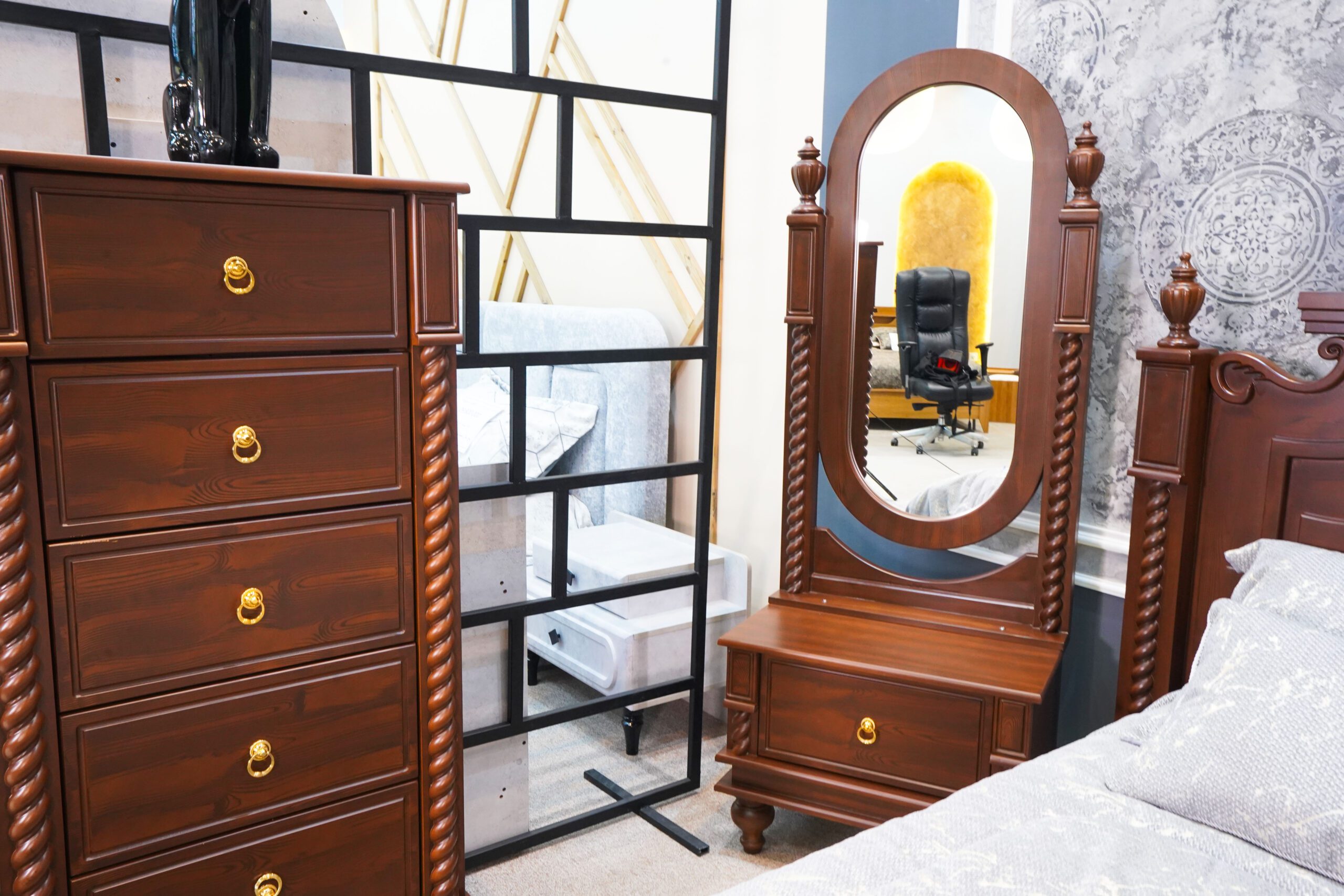 میز آرایش این سرویس، با فرم خمیدهی آینهی اصلی و کندهکاریهای کلاسیک، جلوهای بینظیر دارد. کشوهای متعدد، امکان نظمدهی دقیق به لوازم آرایش و زیورآلات را فراهم میآورد. نشیمنگاه پاف با پارچهای لطیف و رنگ گرم، با راحتی کامل طراحی شده است.