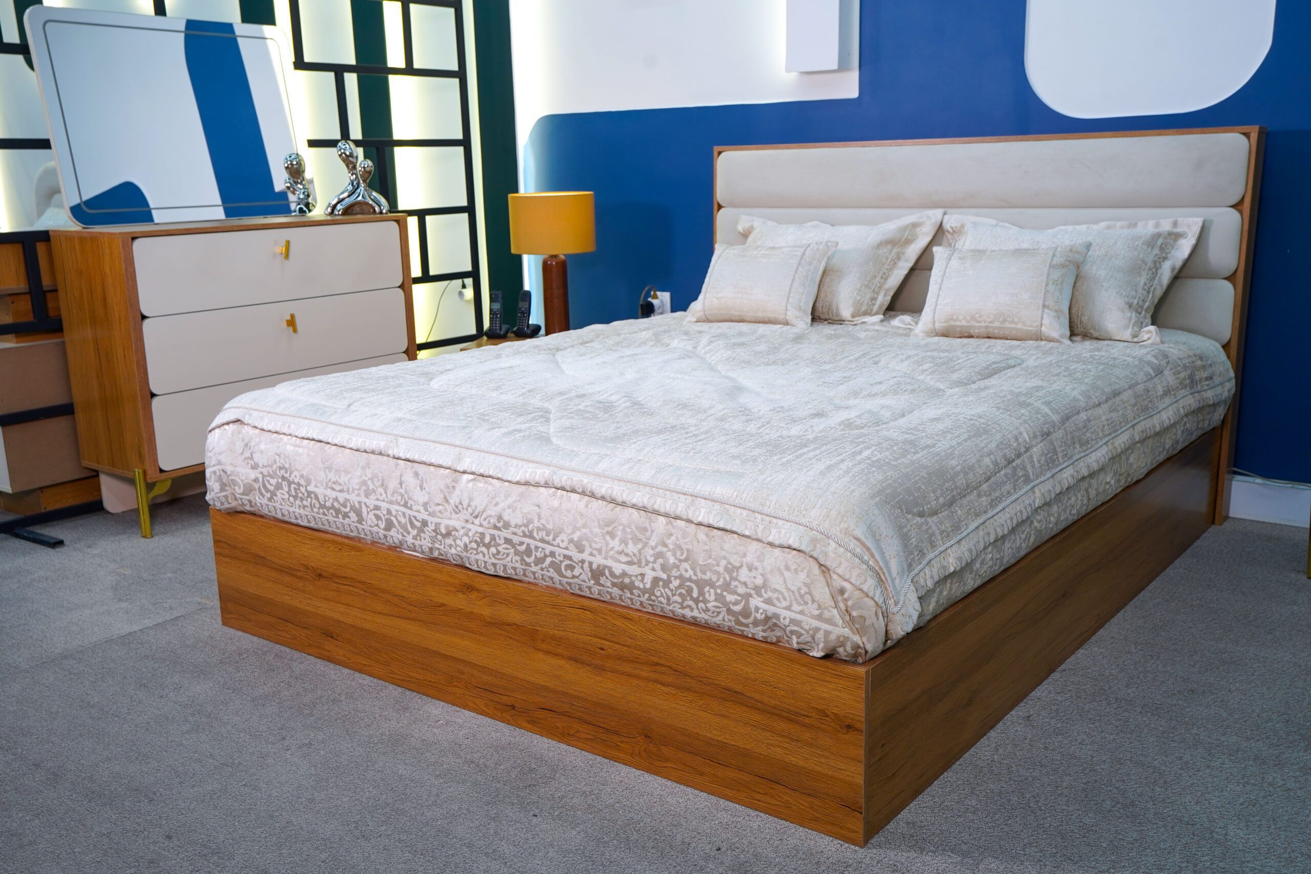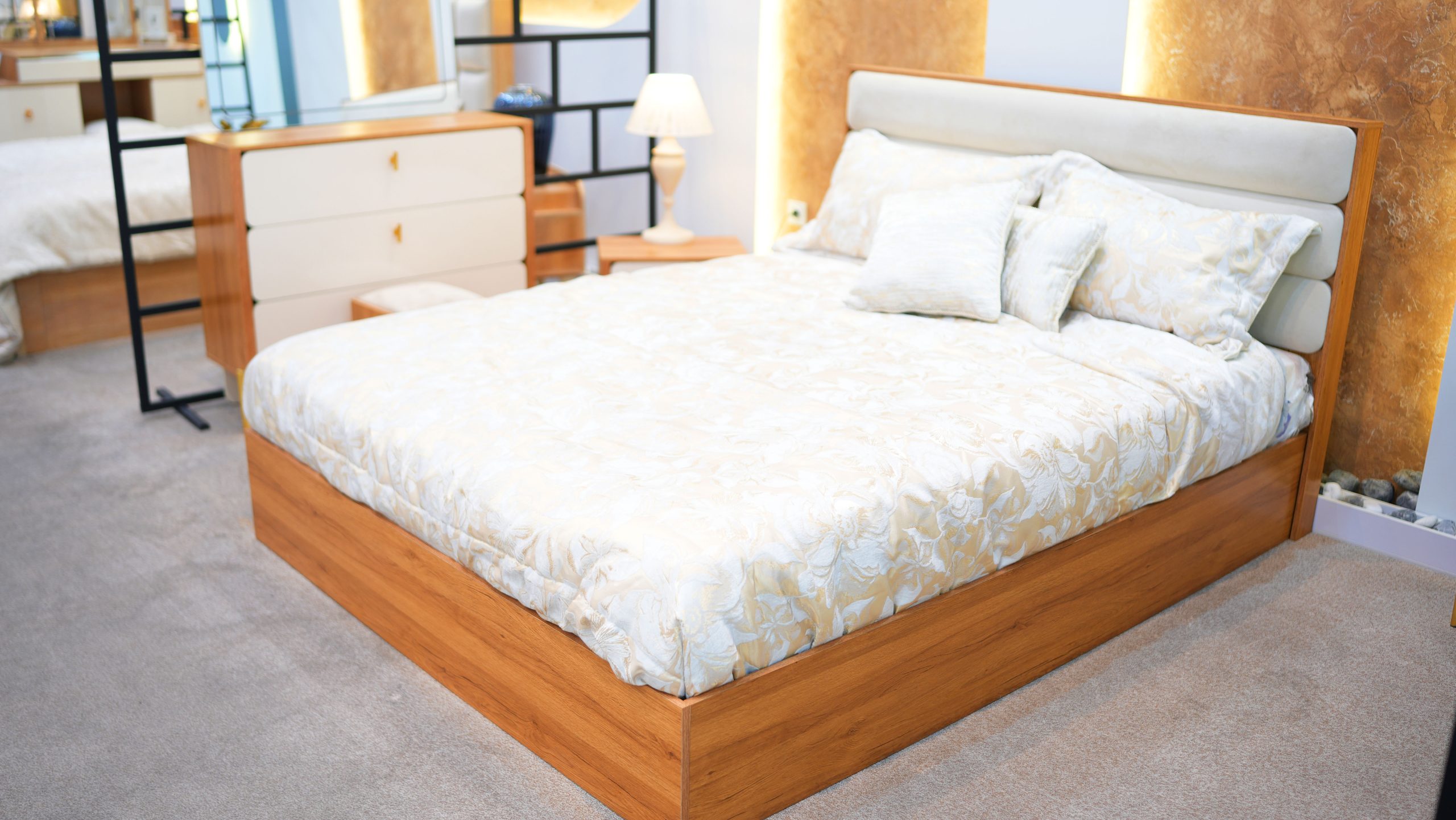 تناسب رنگ بدنه و تاج نیز از ویژگیهای برجسته این سرویس خواب چوبی است. چوب راش روشن و طبیعی بدنه تخت در کنار رنگ پارچه خنثی و گرم تاج، فضایی دلنشین و آرامشبخش به اتاق خواب میبخشد. این سرویس خواب ارزان و شیک با ابعاد استاندارد تخت خواب دو نفره، انتخابی مناسب برای هر فضایی است. چه به دنبال تخت خواب ارزان برای اتاقهای کوچک باشید و چه فضای بزرگتری در اختیار داشته باشید، این مدل به خوبی با محیط هماهنگ میشود.