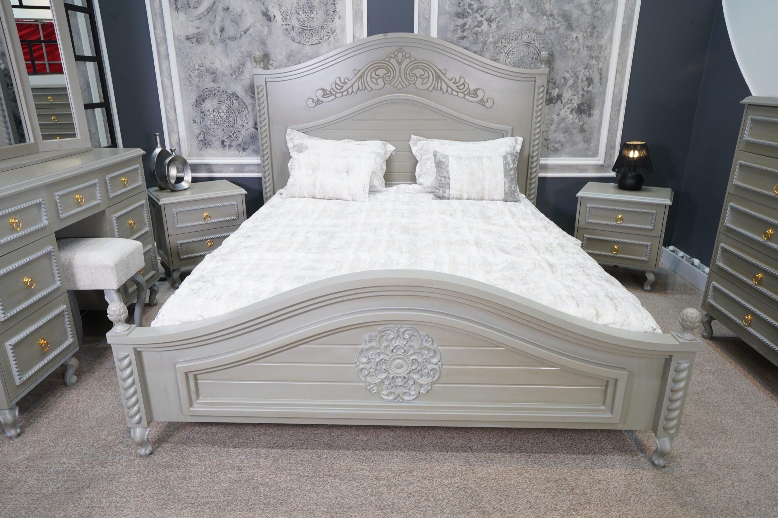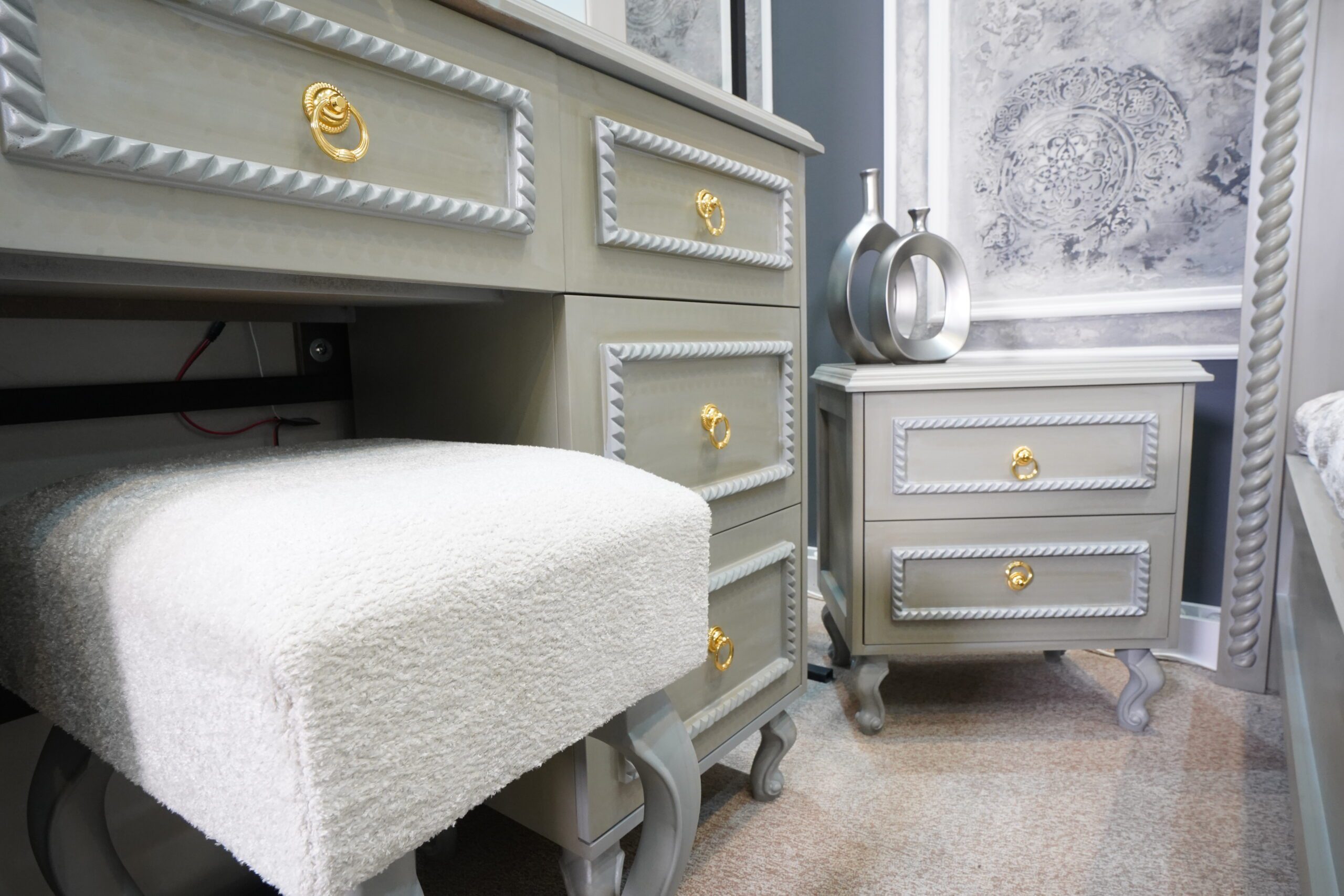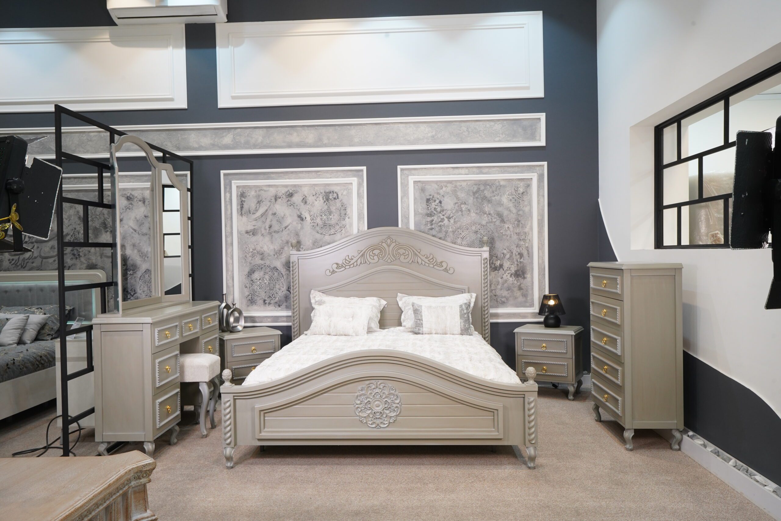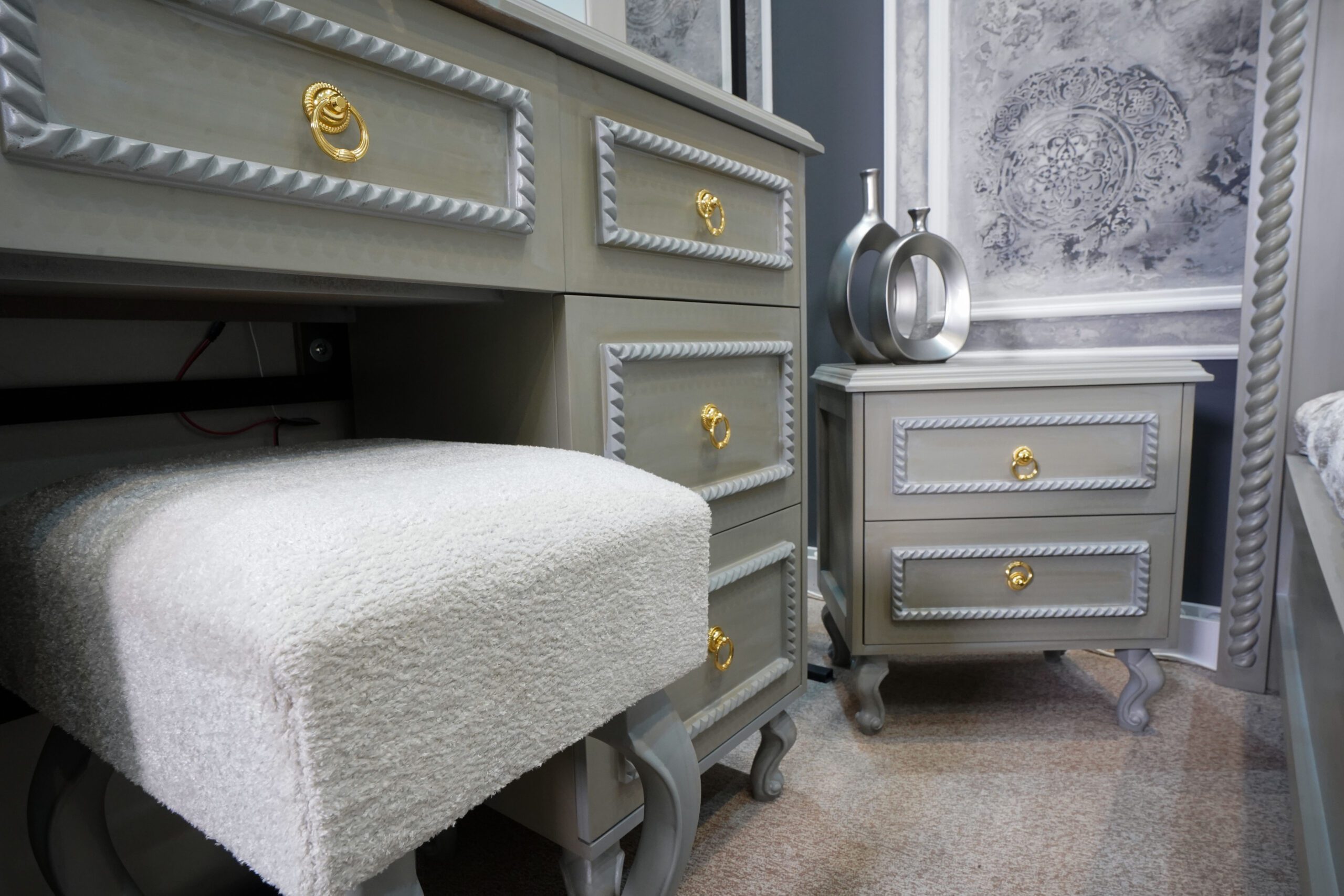 دو عدد پاتختی شیک با بدنهی طوسی-کرم، پایههای منحنی کلاسیک و دستگیرههای طلایی، در کنار تخت قرار گرفتهاند تا هم مکمل زیبایی باشند و هم عملکردی کاربردی ارائه دهند.