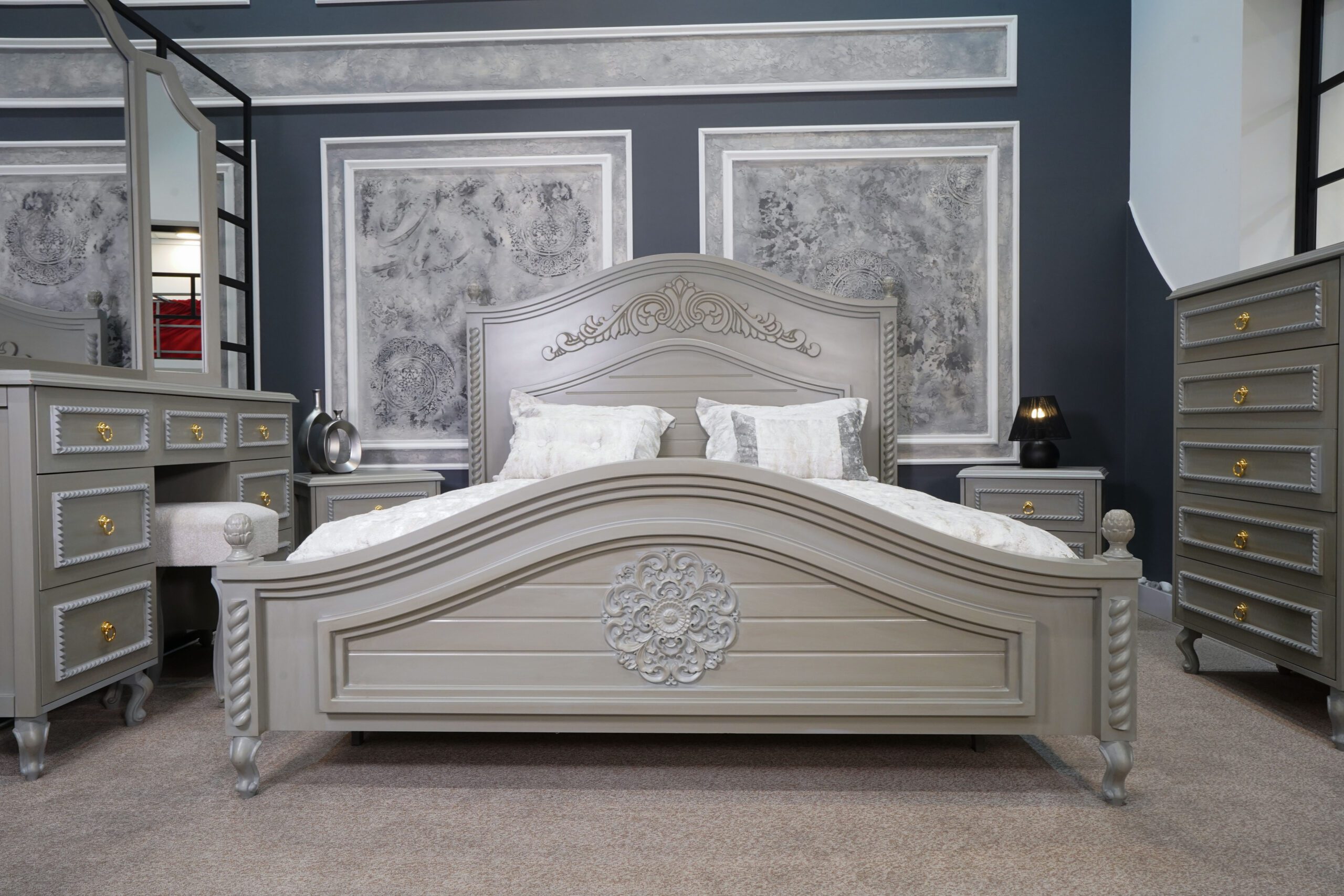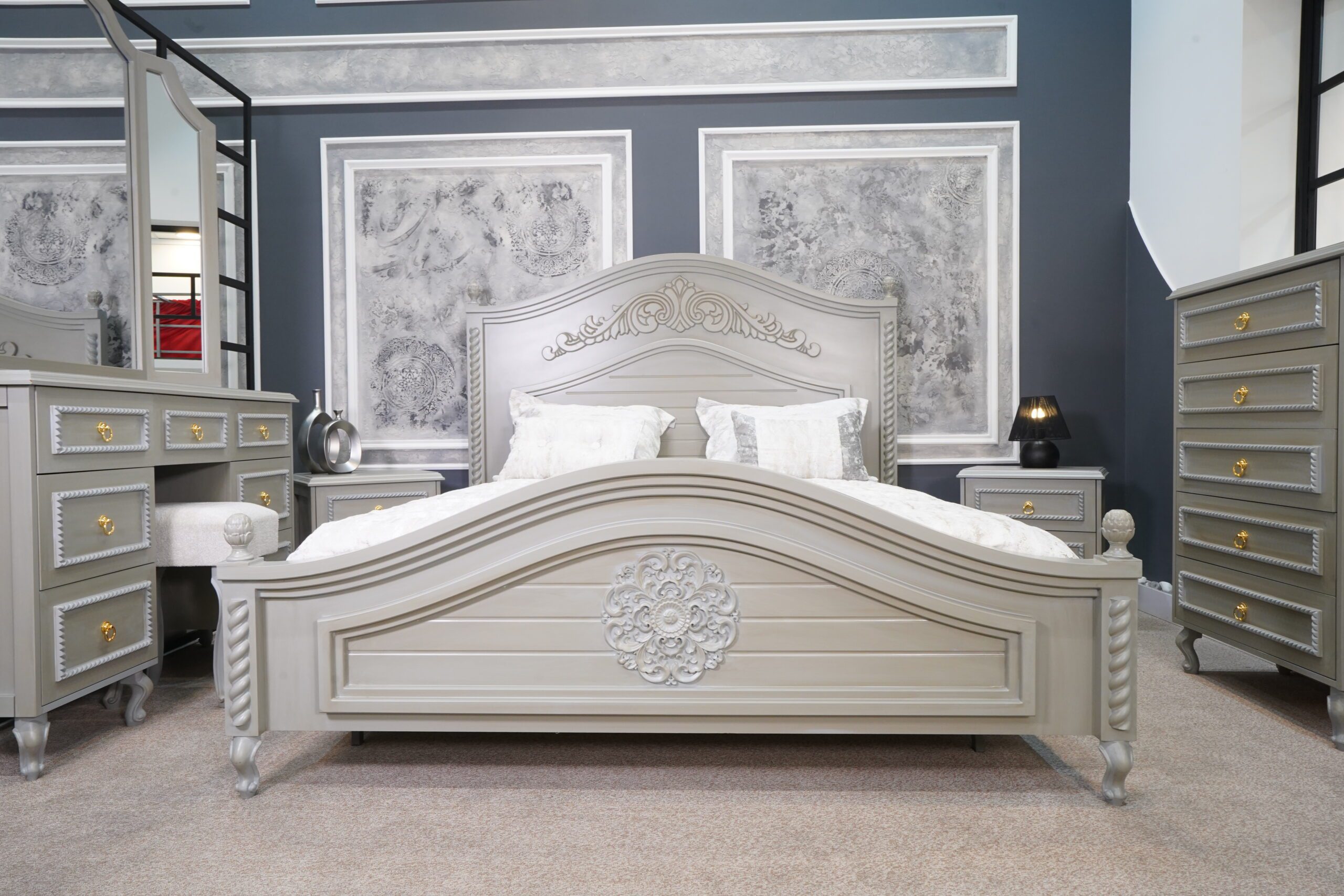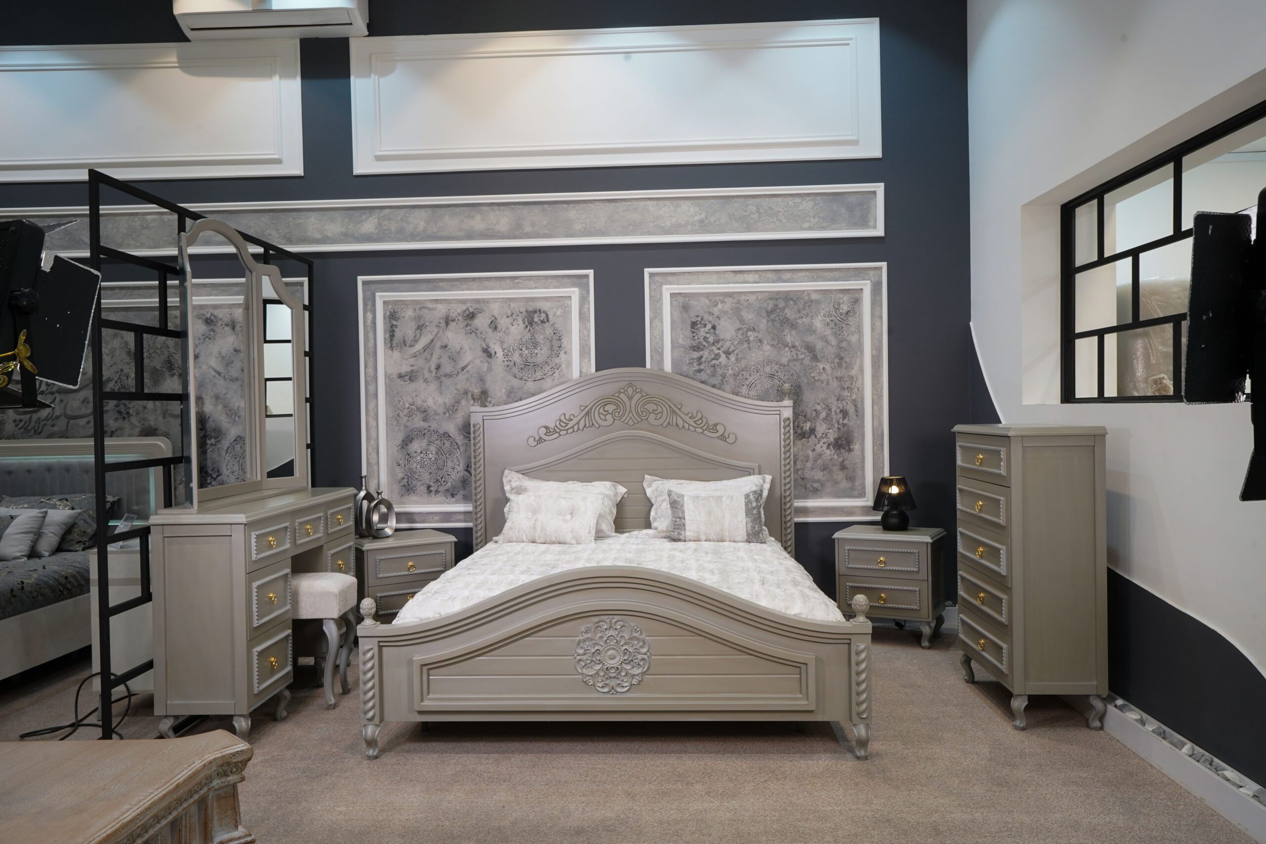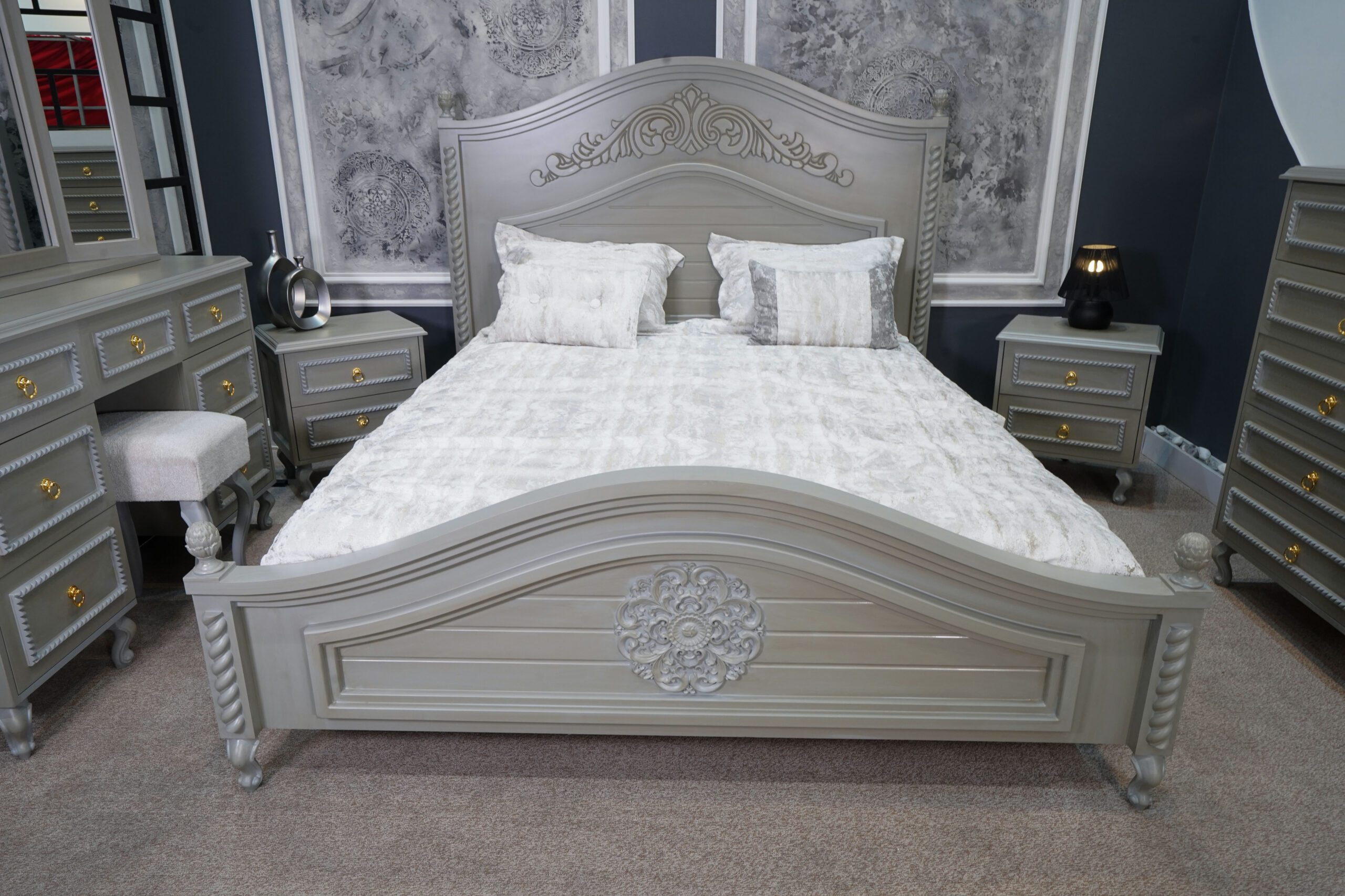 دو عدد پاتختی شیک با بدنهی طوسی-کرم، پایههای منحنی کلاسیک و دستگیرههای طلایی، در کنار تخت قرار گرفتهاند تا هم مکمل زیبایی باشند و هم عملکردی کاربردی ارائه دهند.