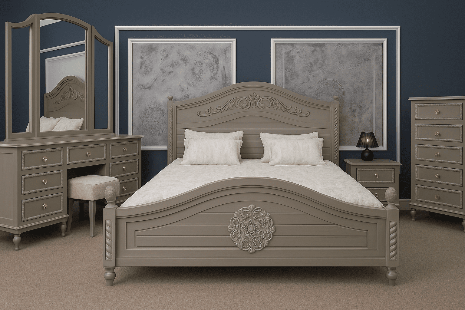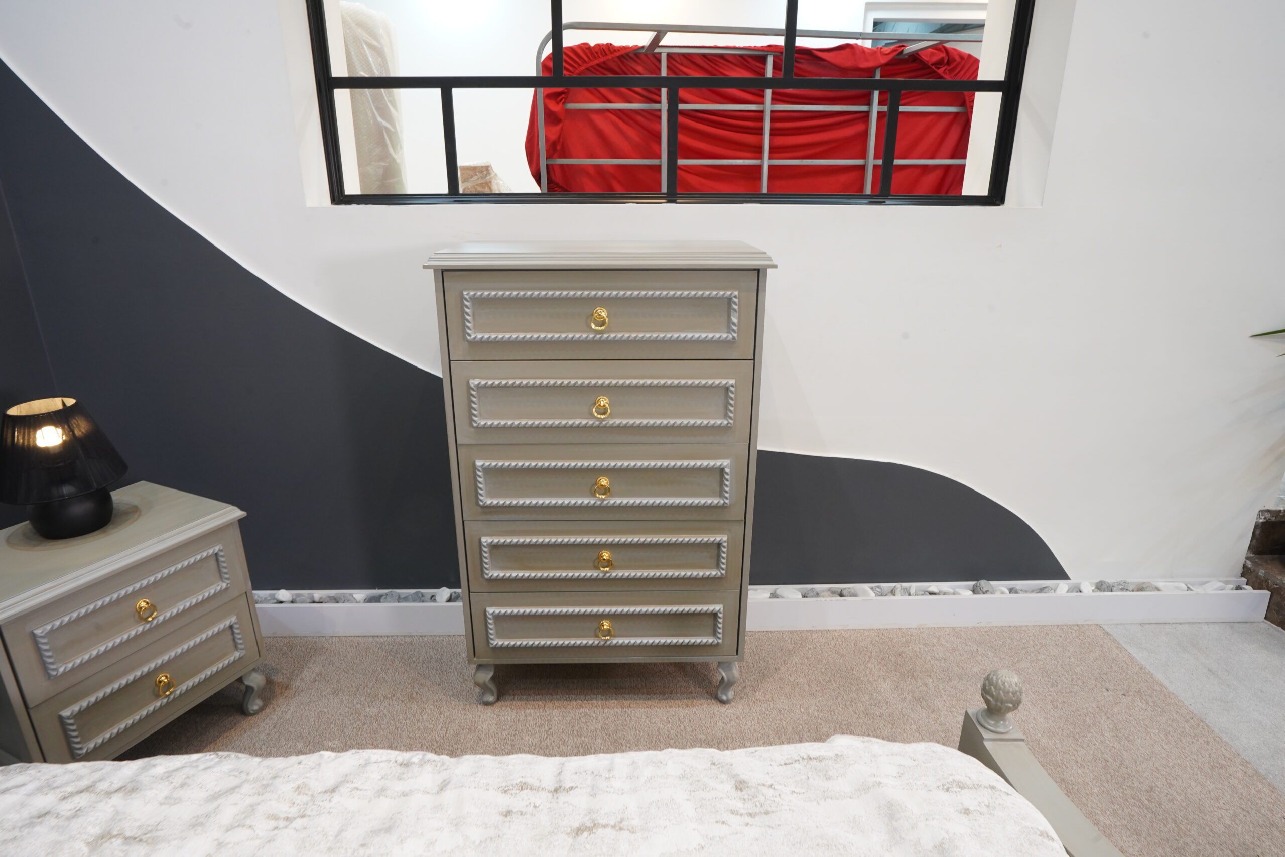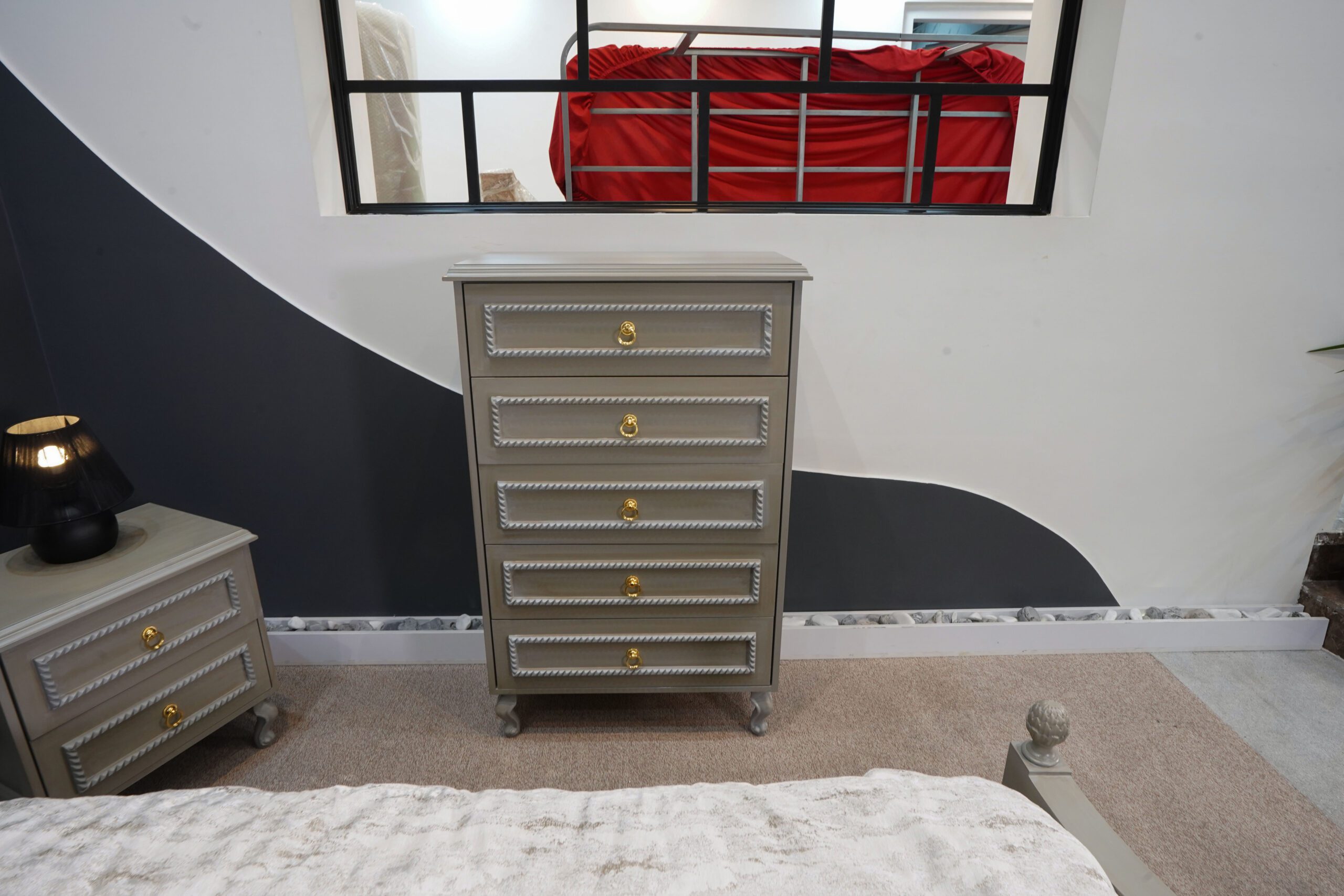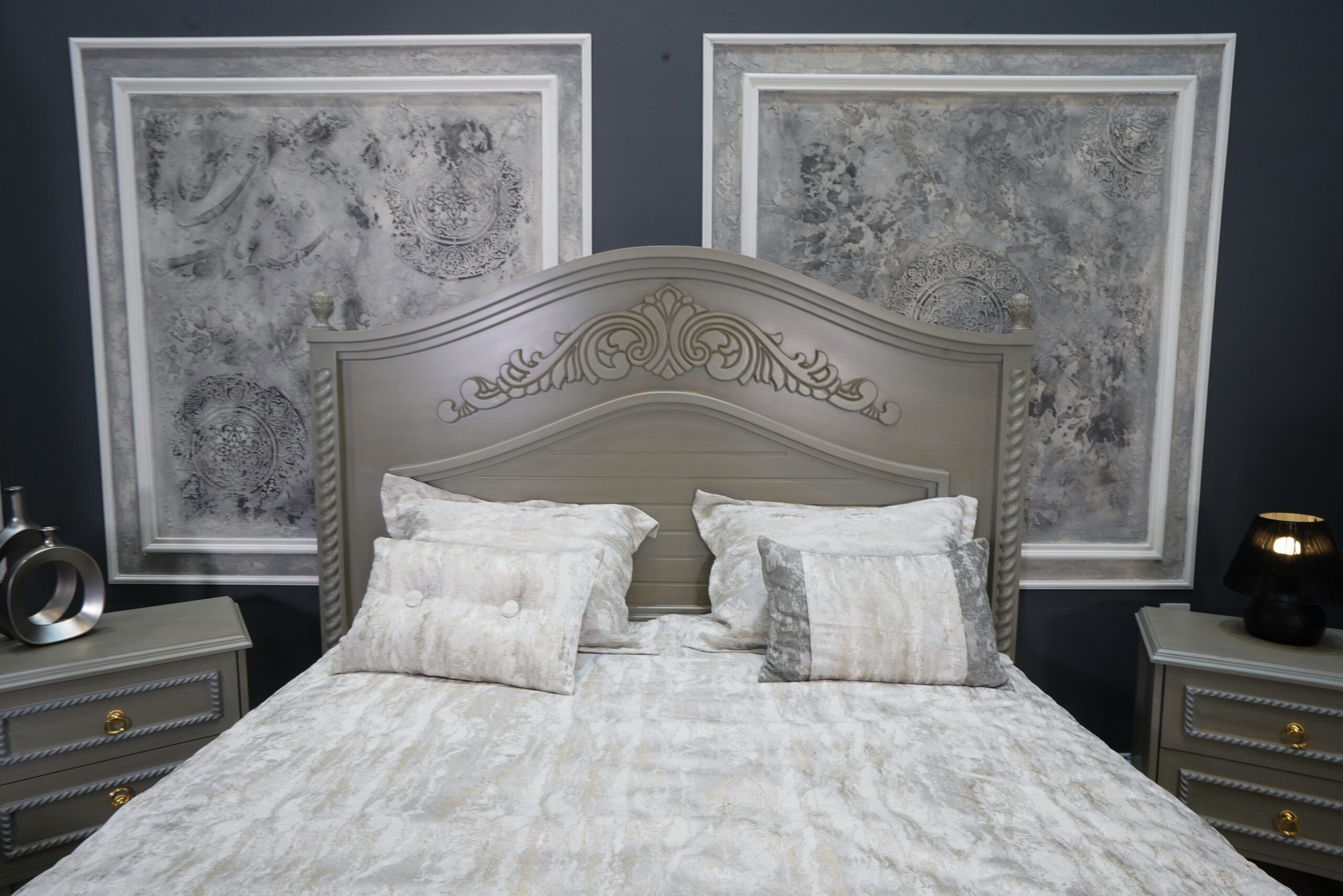 دو عدد پاتختی شیک با بدنهی طوسی-کرم، پایههای منحنی کلاسیک و دستگیرههای طلایی، در کنار تخت قرار گرفتهاند تا هم مکمل زیبایی باشند و هم عملکردی کاربردی ارائه دهند.