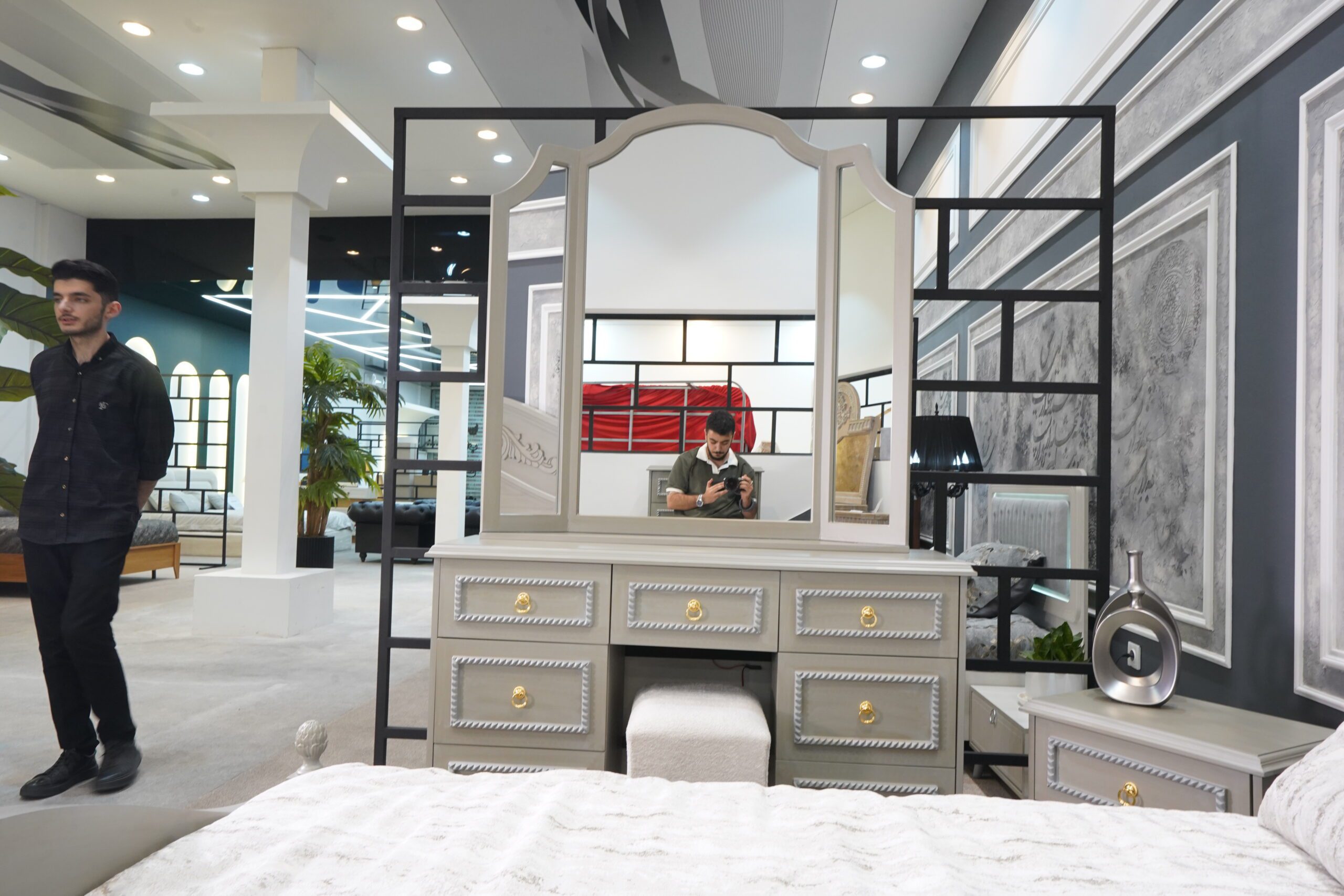 میز آرایش سهقسمتی با آینههای خمیدهی ایستاده، چهار کشوی جادار و یک صندلی پاف مخملی، نهتنها زیباست بلکه فضایی کاملاً کاربردی برای روتین روزانهتان فراهم میآورد. طراحی آینهها نور را منعکس کرده و فضا را بزرگتر نشان میدهد.