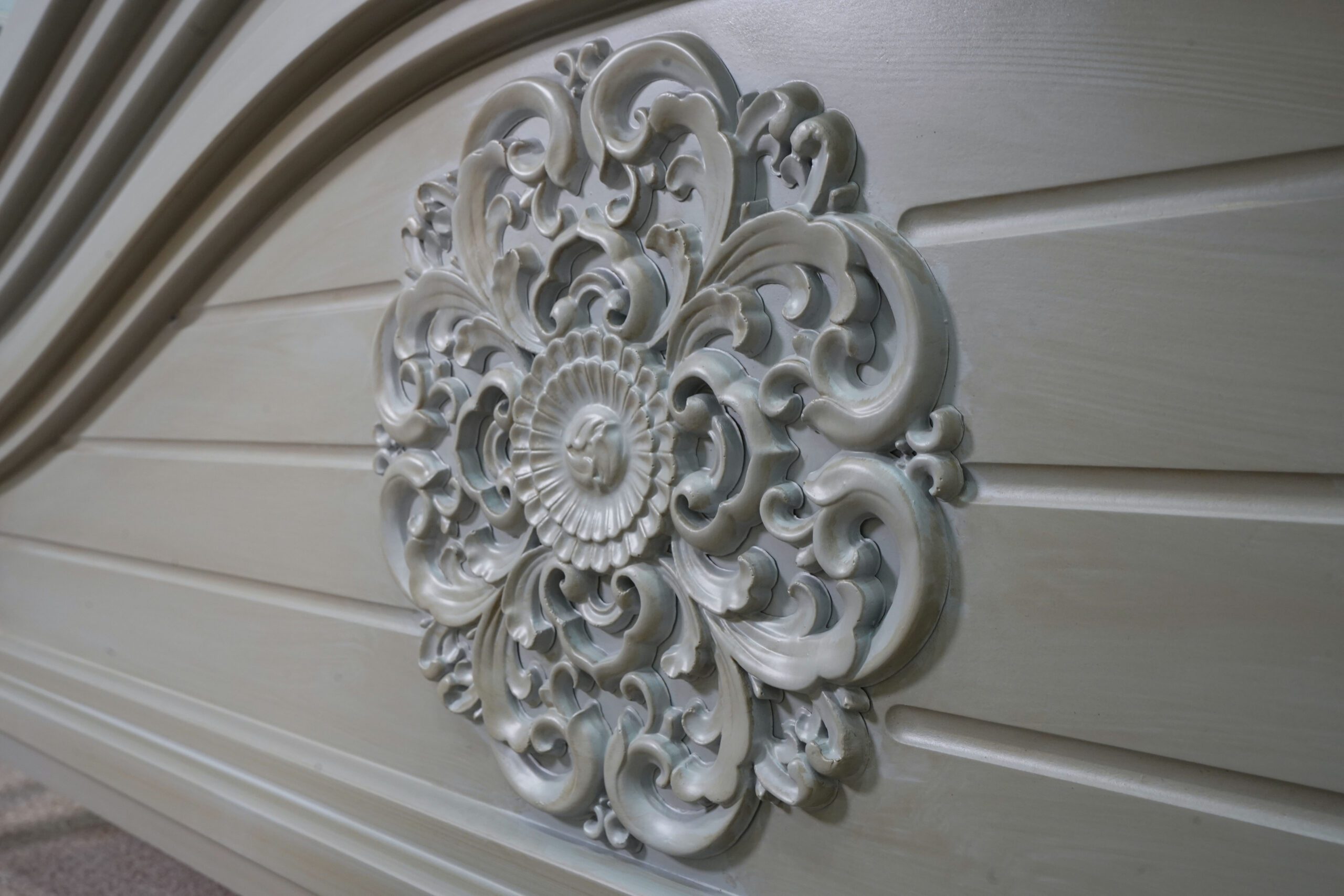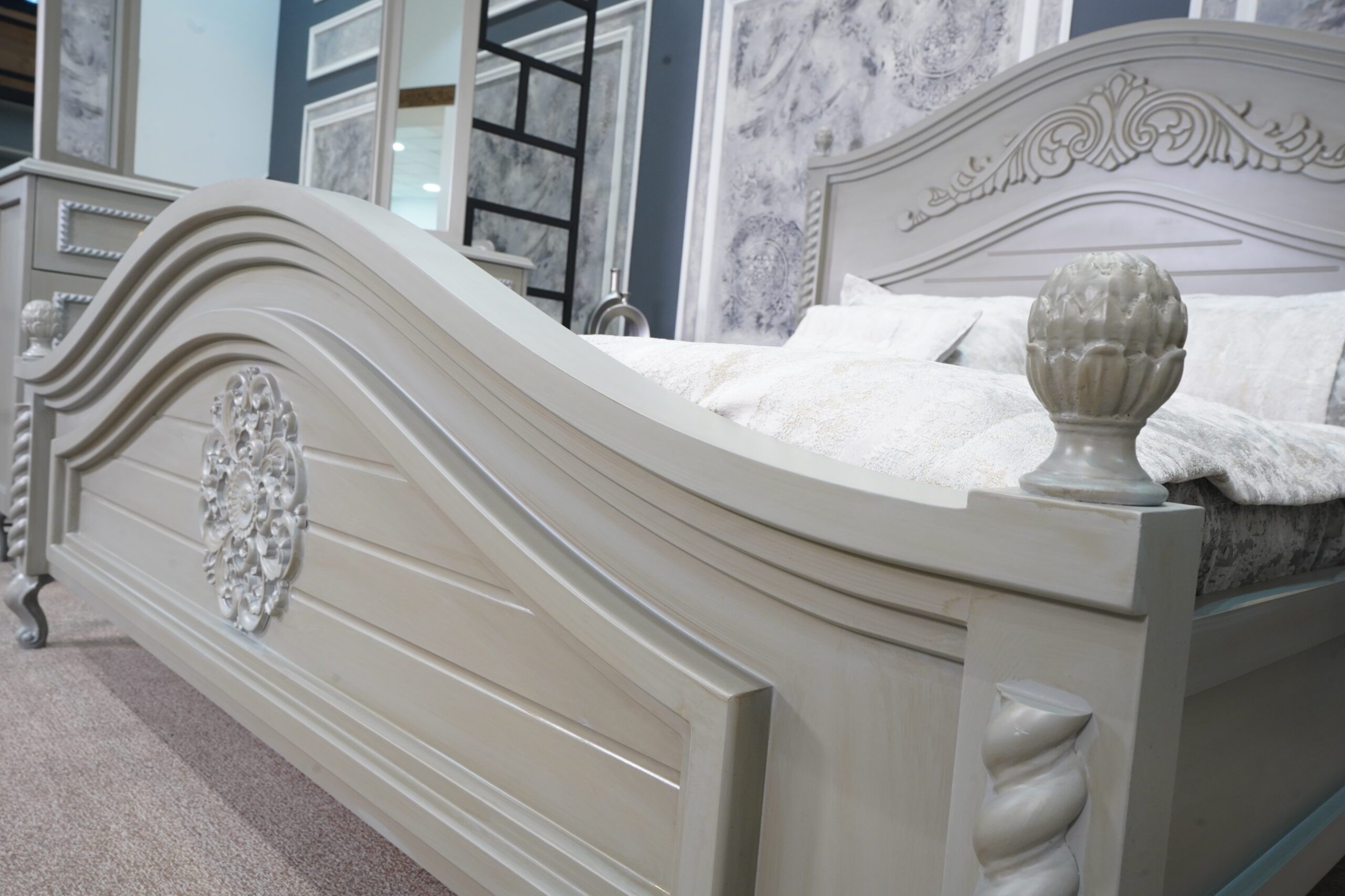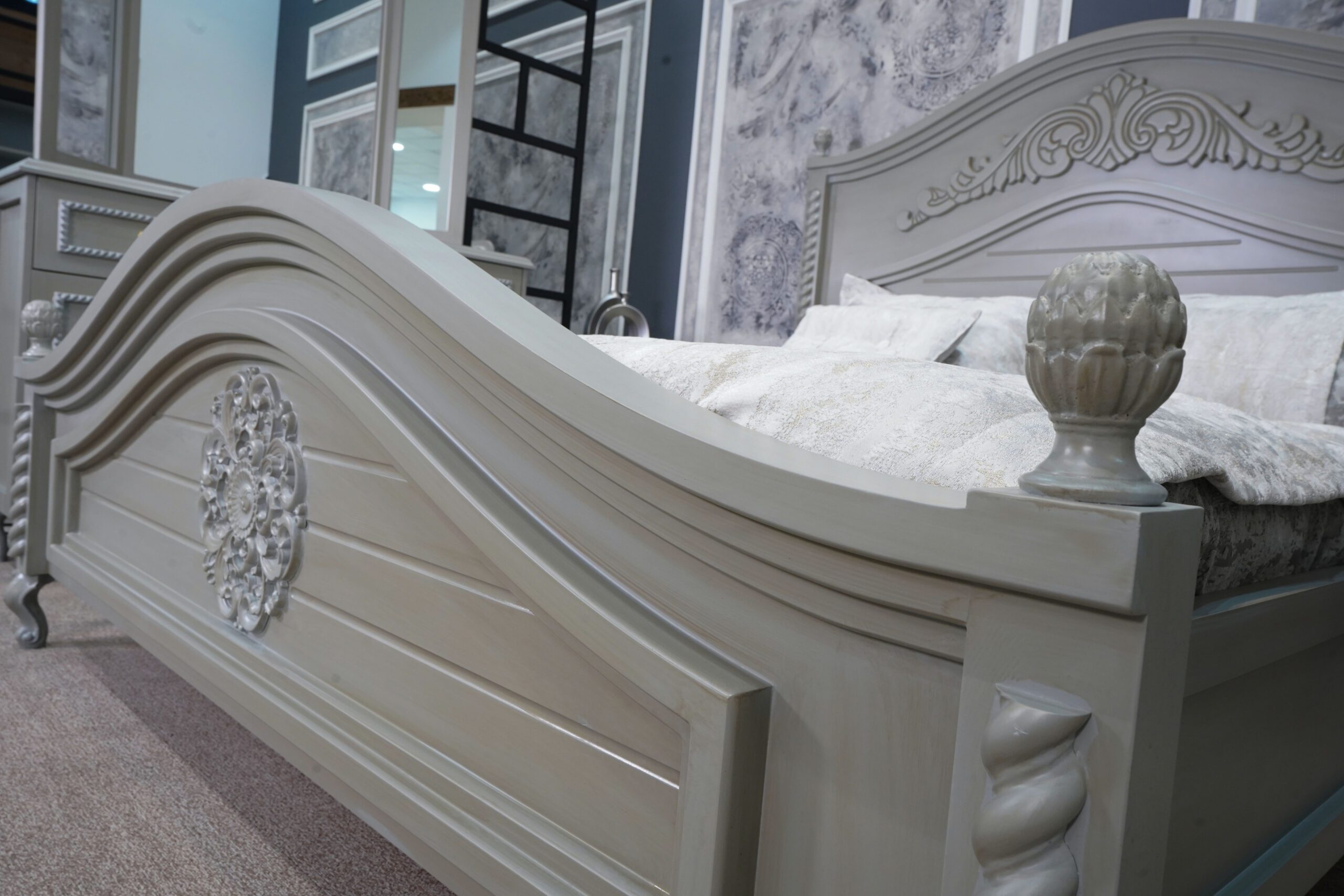 تاج بلند این تخت خواب با منحنیهای ملایم و حجاریهای الهامگرفته از نقوش اسپانیایی طراحی شده که علاوهبر جلوهی بصری دلنشین، به فضای اتاق شخصیت و عمق میبخشد. ترکیب رنگ طوسی-کرم با تزئینات چوبی برجسته، حالوهوایی از اصالت و آرامش به فضا اضافه میکند.